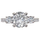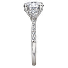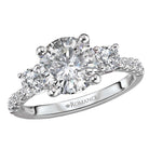 Diamonds line this 14kt white gold band and two round diamonds are set on either side of a center setting that will accommodate a 8.2mm round diamond. (D 5/8 carat total weight)