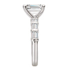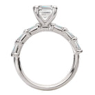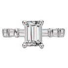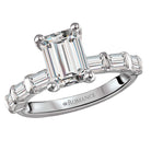 14kt white gold semi-mount engagement ring with baguette diamonds channel set along the shank on either side of a center setting that will accommodate a 8.5x6mm emerald cut diamond. (D 7/8 carat total weight)
