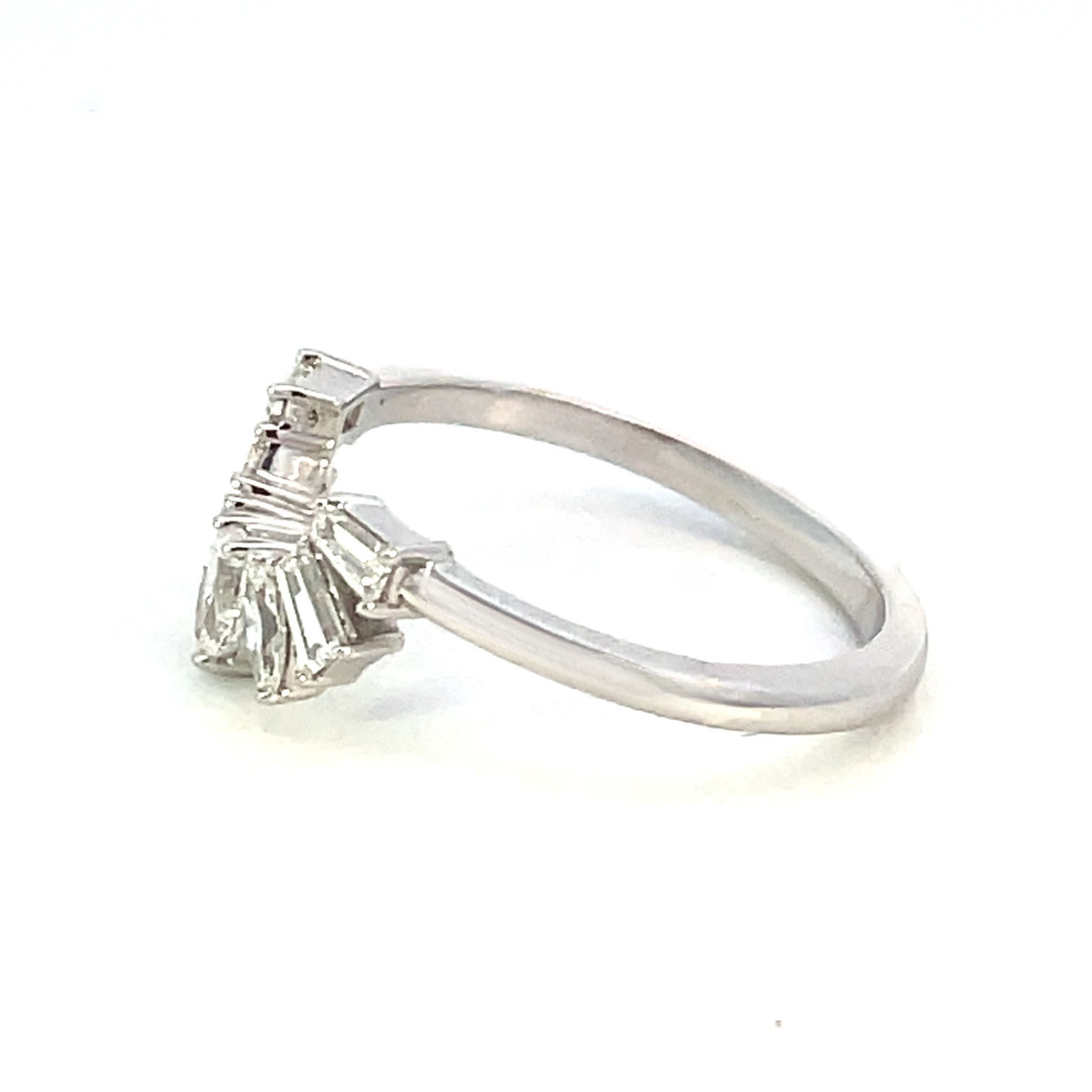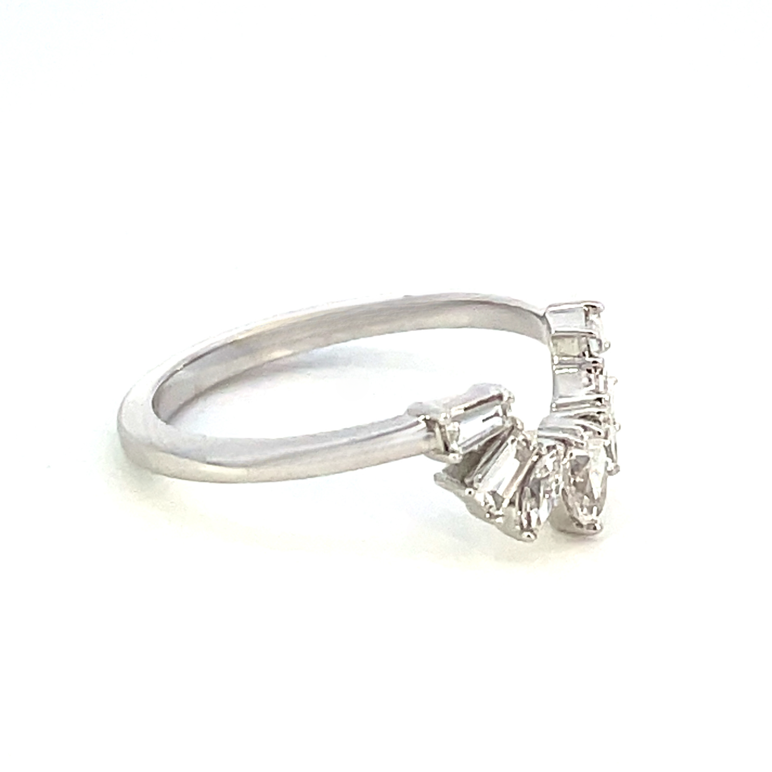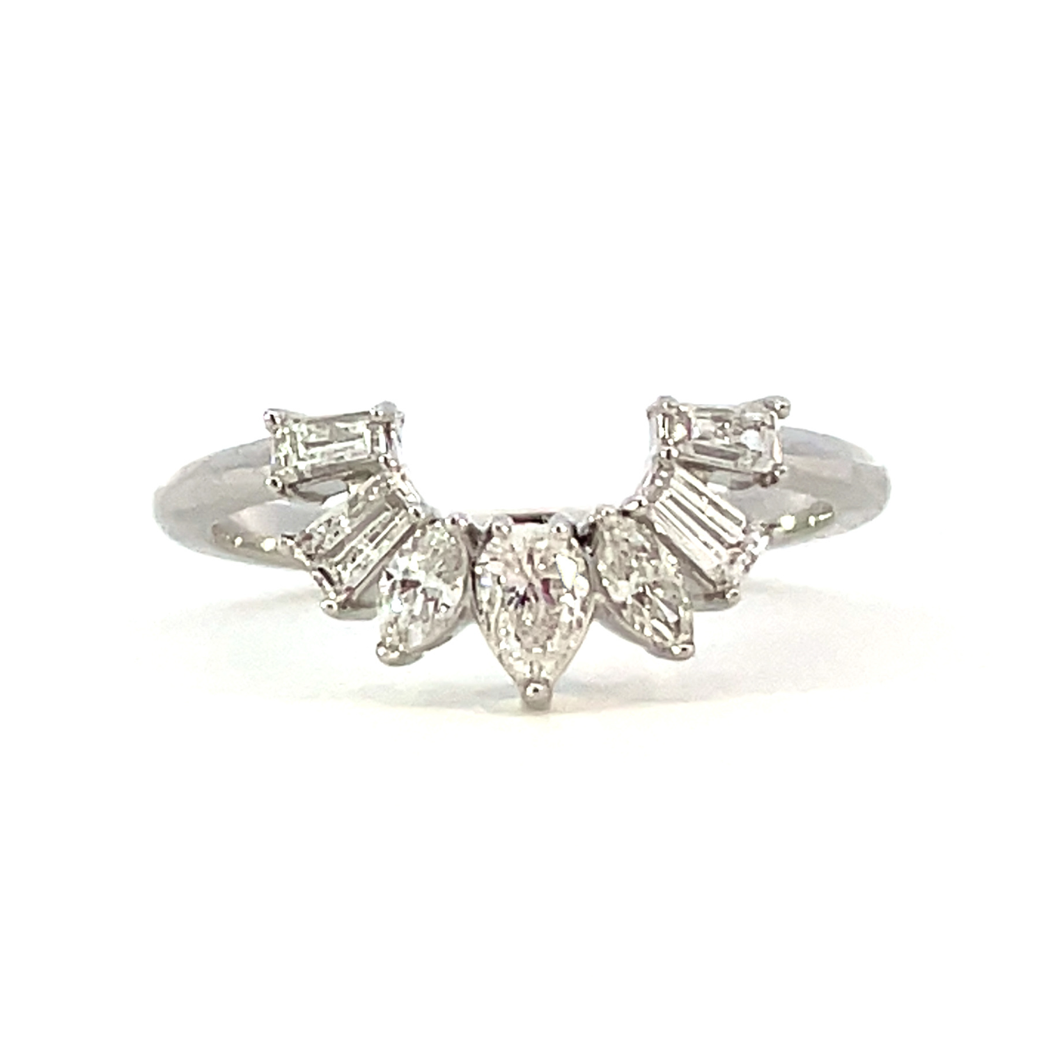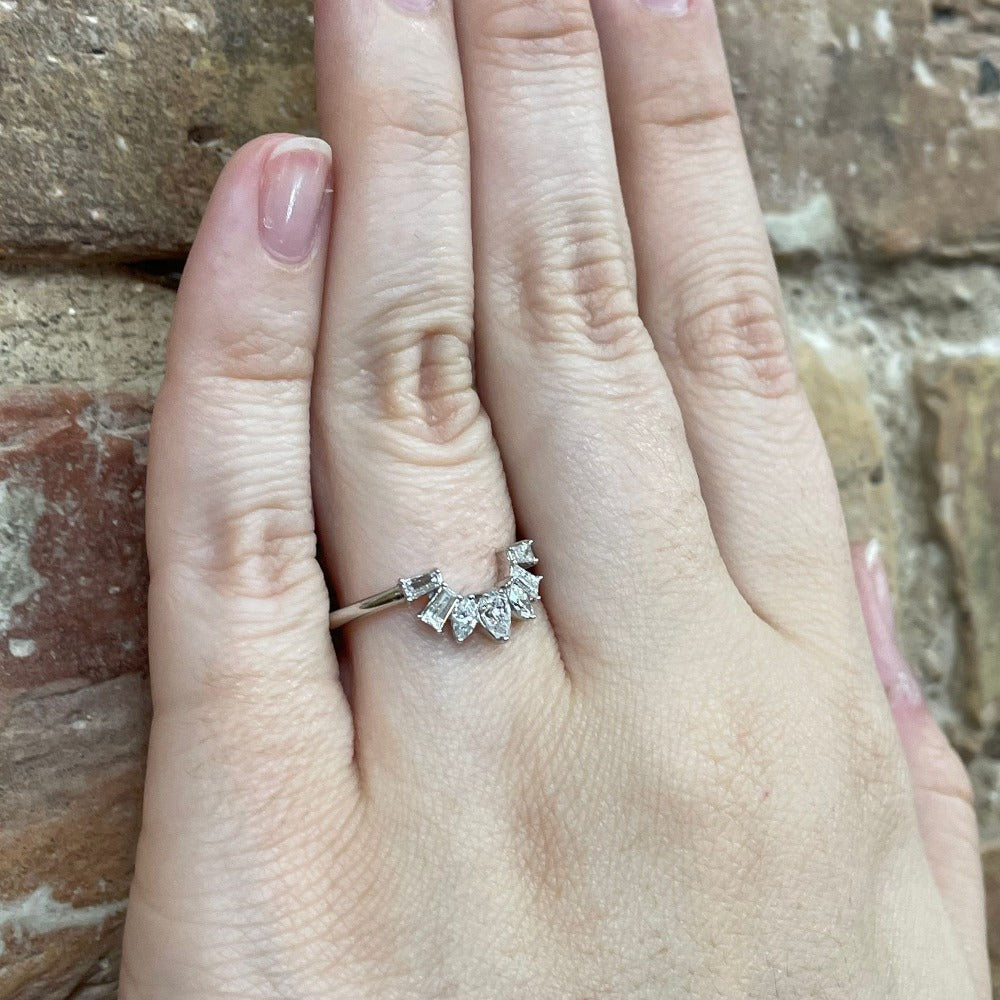 This stunning ring guard features beautifully cut diamonds in a curved setting. This ring guard would make a breathtaking addition to any engagement ring to complete a unique and memorable wedding set.