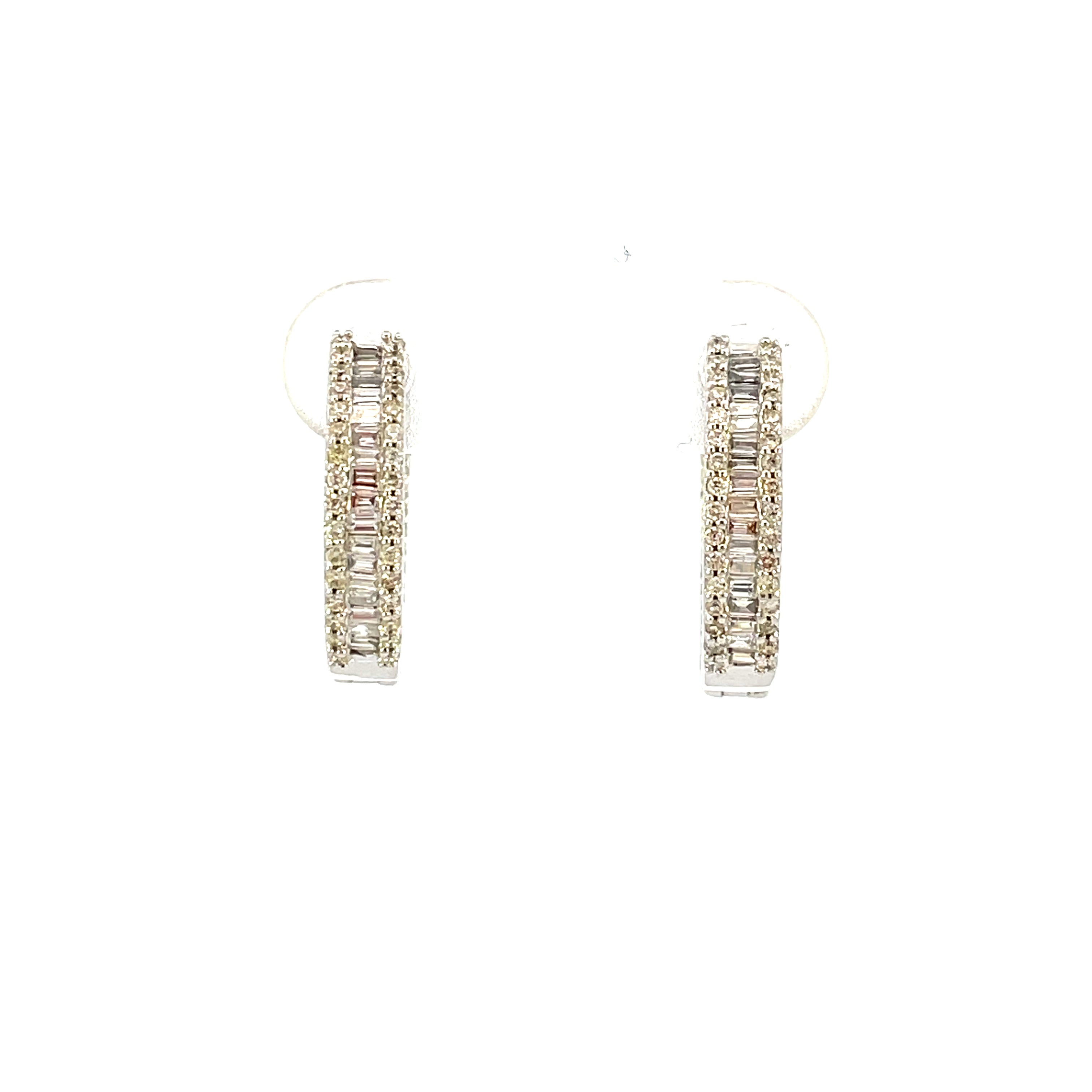 These breathtaking 14K white gold earrings feature baguette and round diamonds in an inside/outside style setting (.82CTW). This means extra diamonds and even more sparkle. These beautiful earrings are sure to impress whether as a treat for yourself or a gift for that special someone.