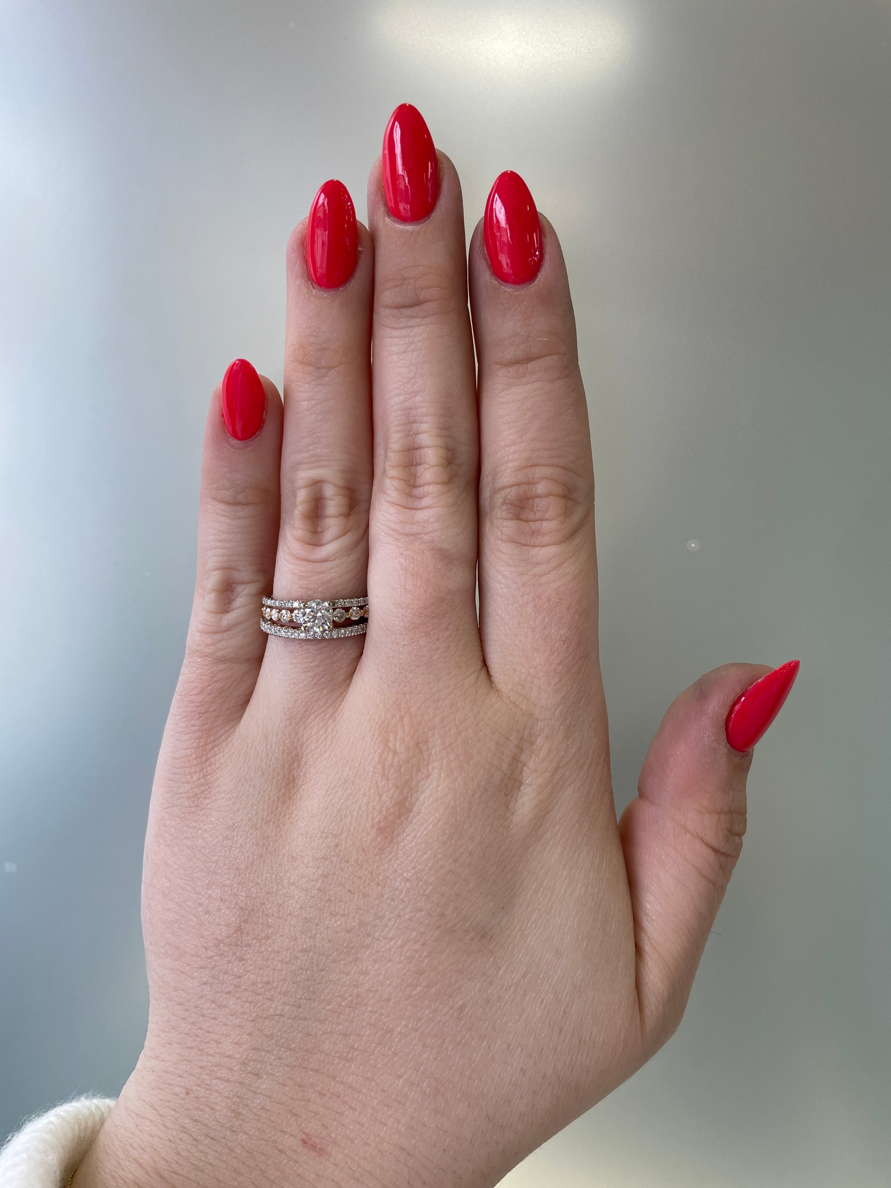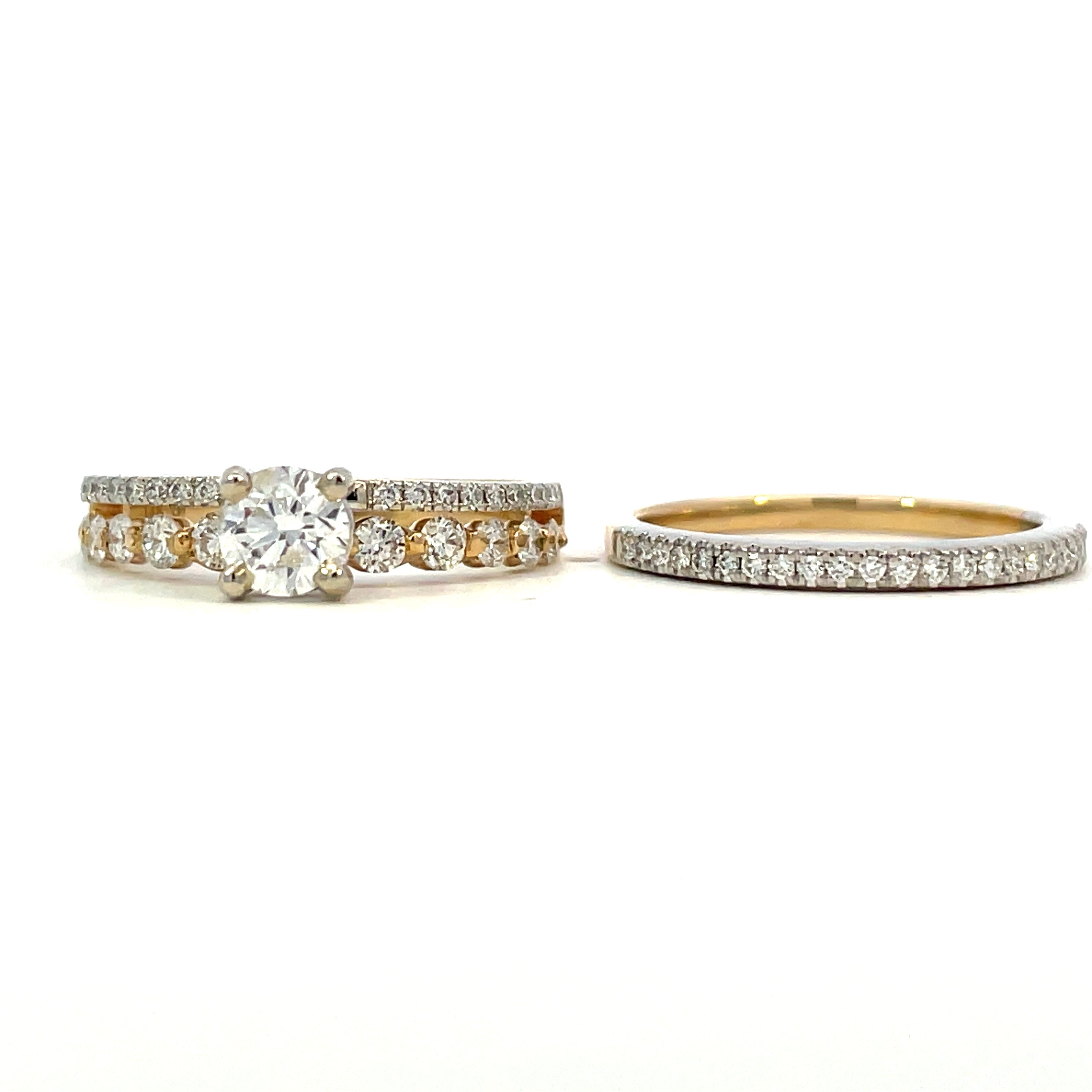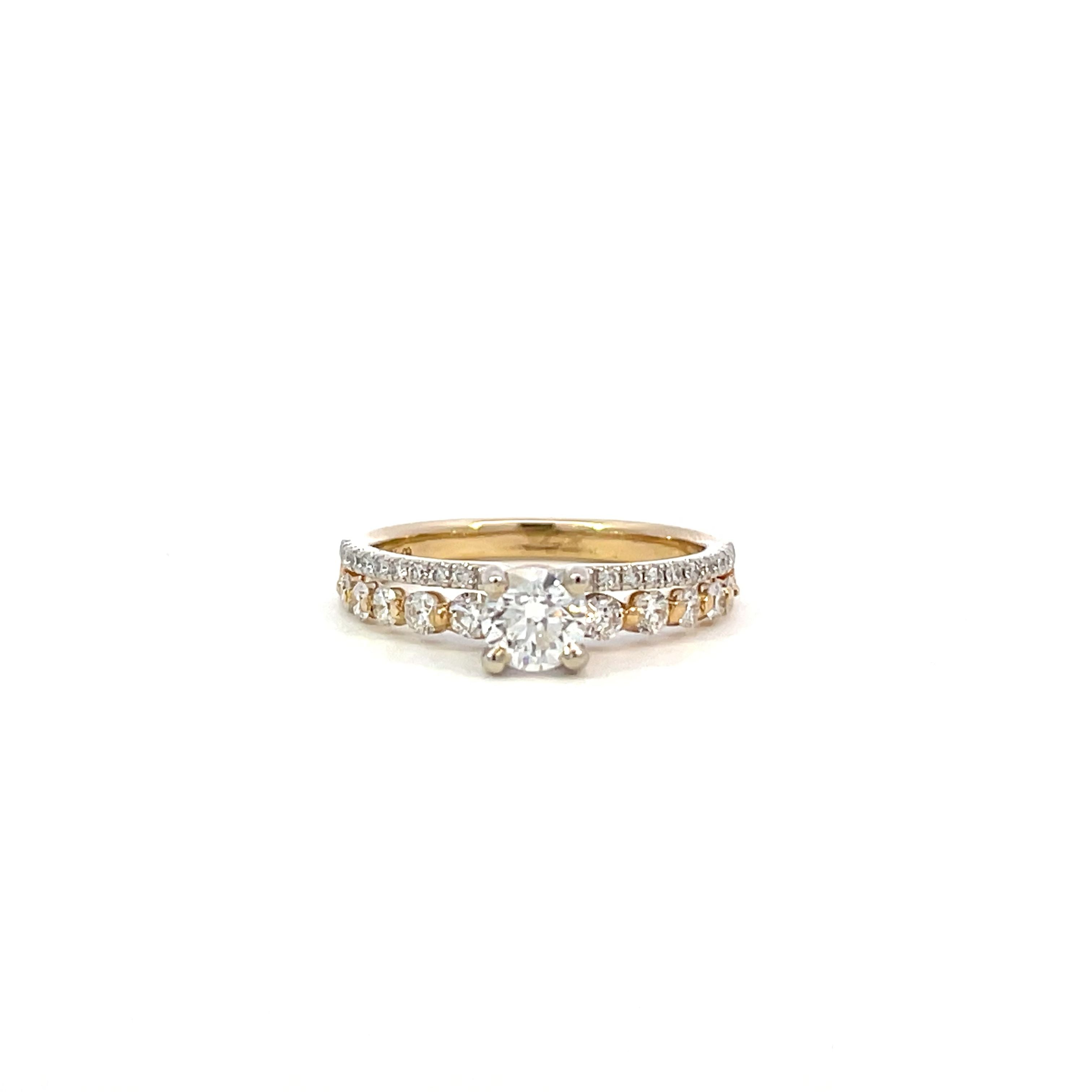 Expertly crafted with a 0.52 carat natural diamond, this 14K yellow gold engagement ring and diamond wedding band set exudes sophistication. The double shank design adds a touch of elegance and a dash of whimsy. Featuring 0.63 carats of round brilliant diamond accents, this set is a timeless and dazzling choice for any couple ready to say "I do."