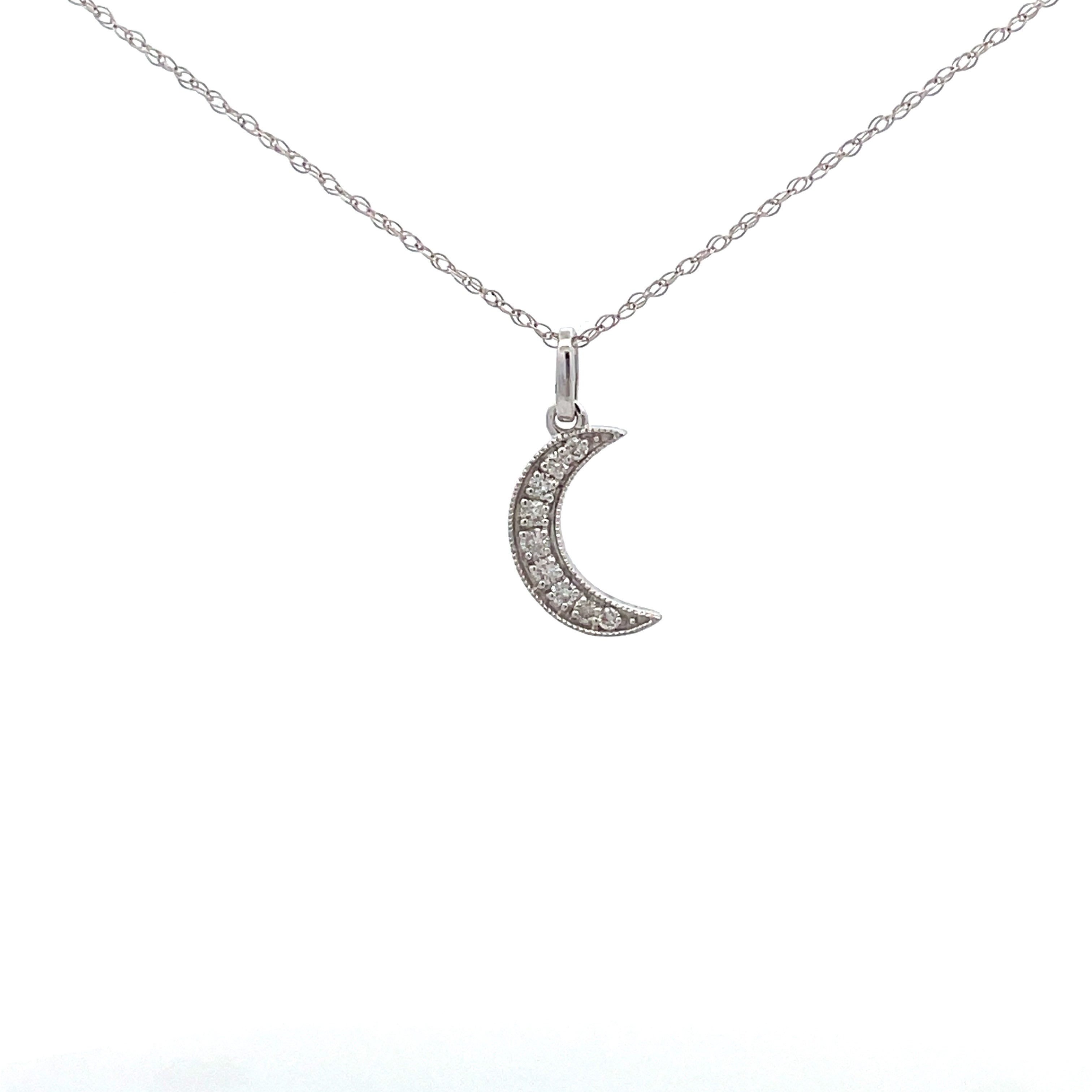 This stunning moon pendant features charming diamonds set in 10K white gold on an 18" chain. It's the perfect way to add a bit of sparkle to your day!