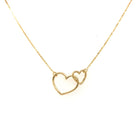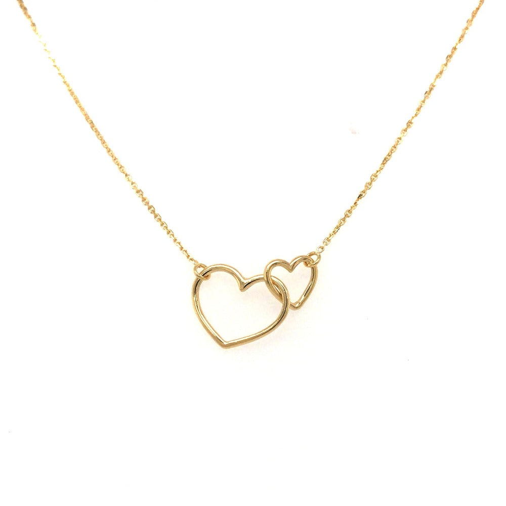 This adorable necklace would make a perfect gift for Mother's Day or the birth of a baby! Features two interlocking hearts that could represent mother and child. Made of solid 14 karat yellow gold with an 18 inch chain.