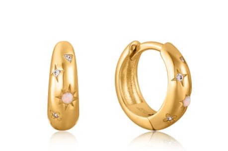 Add some celestial inspired sparkle to your earring stack with these "Starry" opal huggie hoops from our Ania Haie line. These chunky tapered hoops feature white CZ stones and a Kyoto Opal set in a scattered star pattern. Huggie hoops fit close to the ear making them perfect for layering/multiple piercings. Hinge closure.