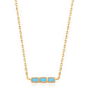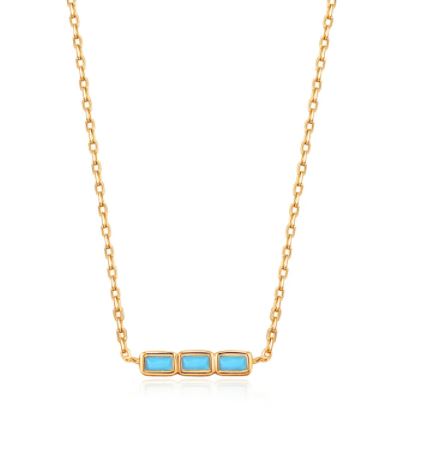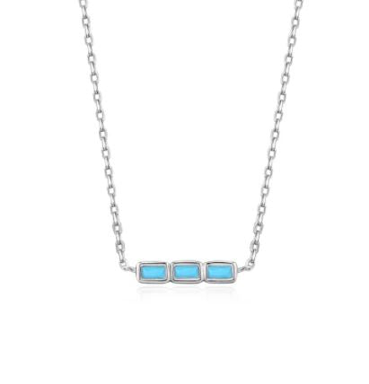 This dainty bar necklace from our Ania Haie line is the perfect piece to add some color to your jewelry collection. Features three rectangular cut turquoise stones bezel set on the bar pendant. Available in plain sterling silver or sterling silver with a yellow gold overlay.