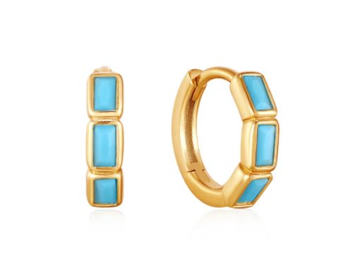 These petite huggie hoops from our Ania Haie line are the perfect piece to add some color to your jewelry wardrobe. Features three rectangular cut turquoise stones bezel set on the front of the hoop. Huggies fit tight to the ear making them great for layering/multiple piercings. Hinged closure.