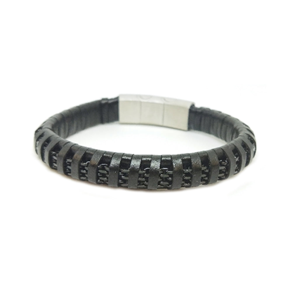 This edgy bracelet would make a great addition to any jewelry collection. Black leather is wrapped around black stainless steel chain and finished with an adjustable magnetic clasp