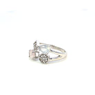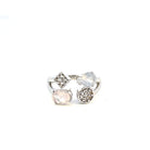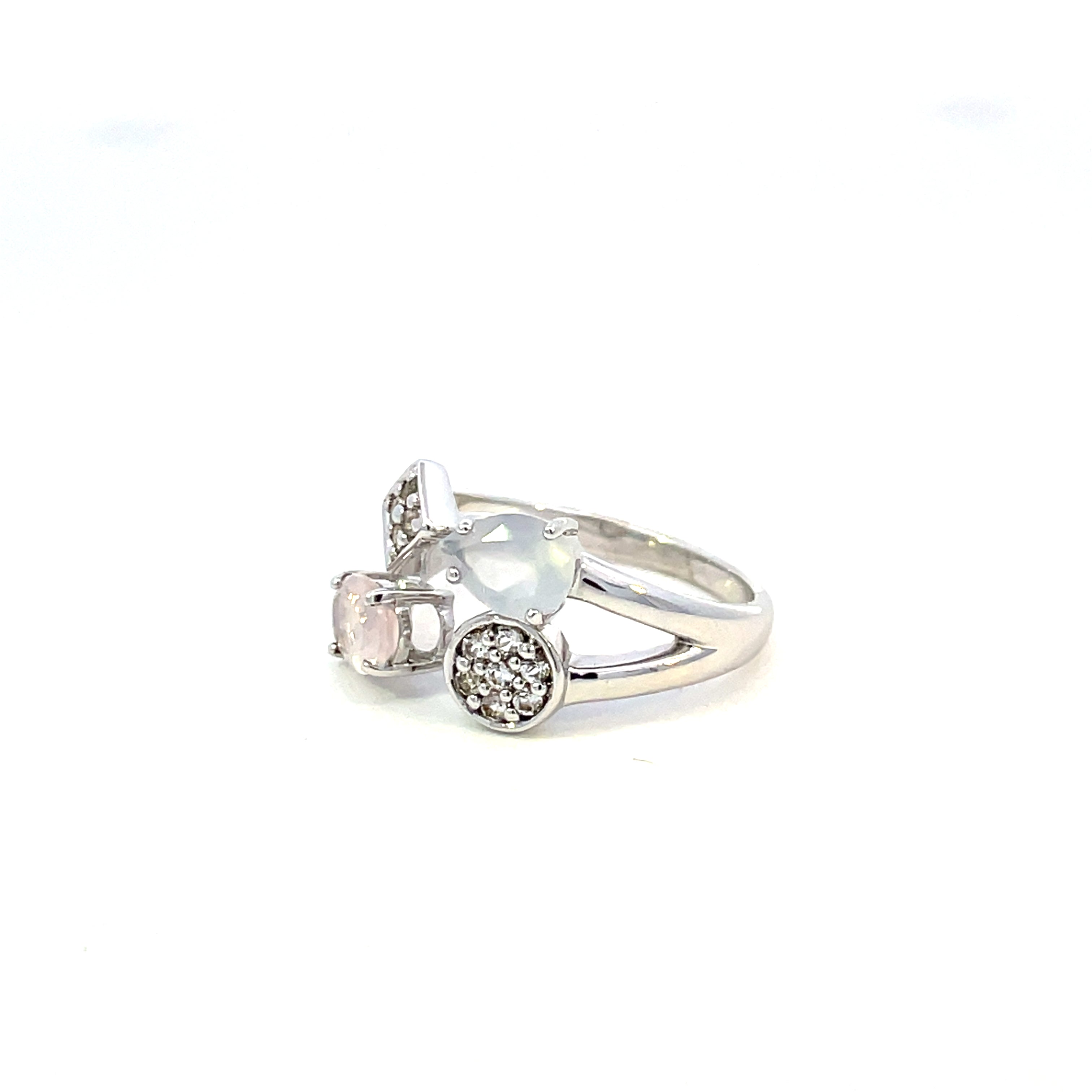 This modern ring features an expertly crafted combination of sterling silver, radiant round white topaz stones, and delicate abstract cut pale pink stones. The result is a stunning piece of jewelry that exudes sophistication and style.