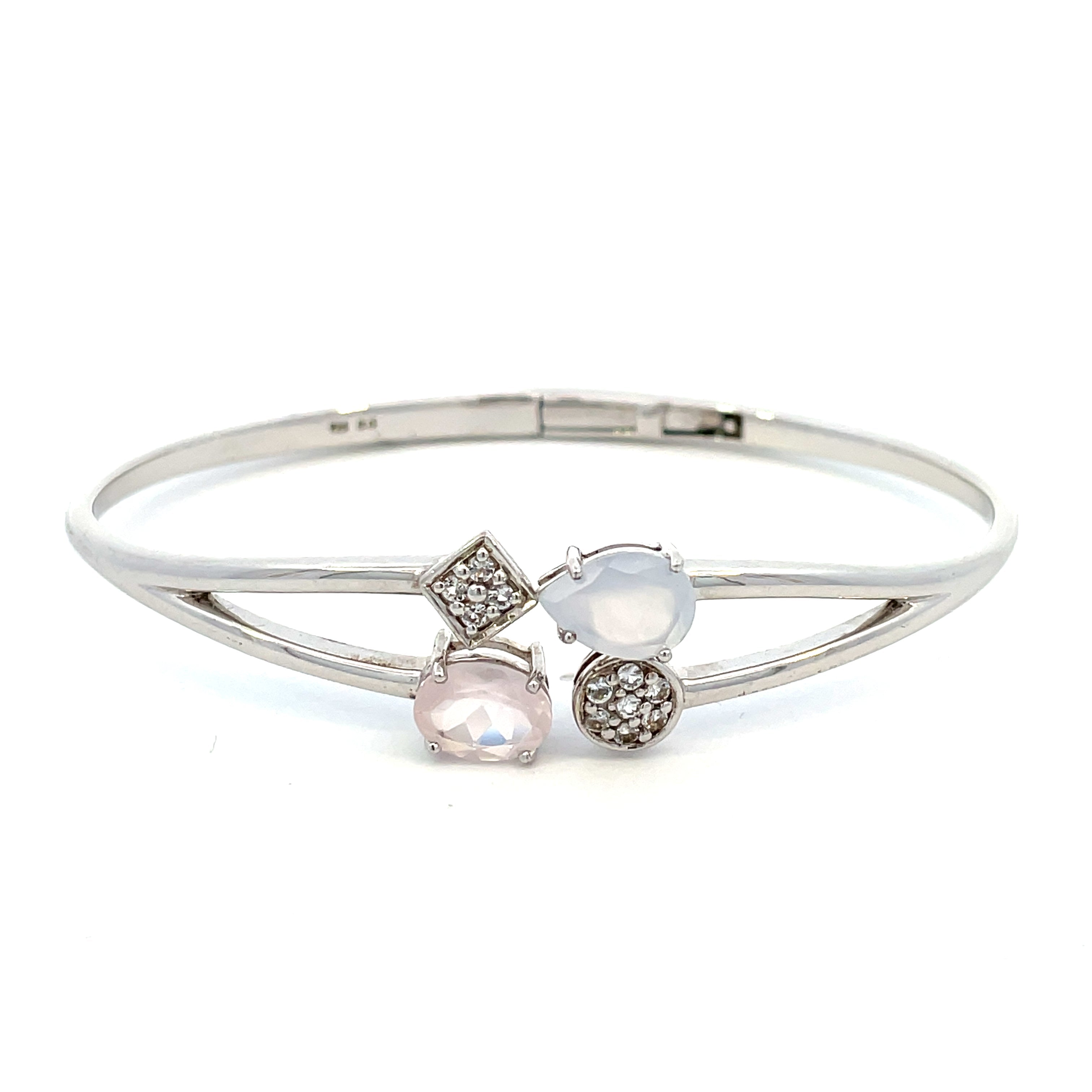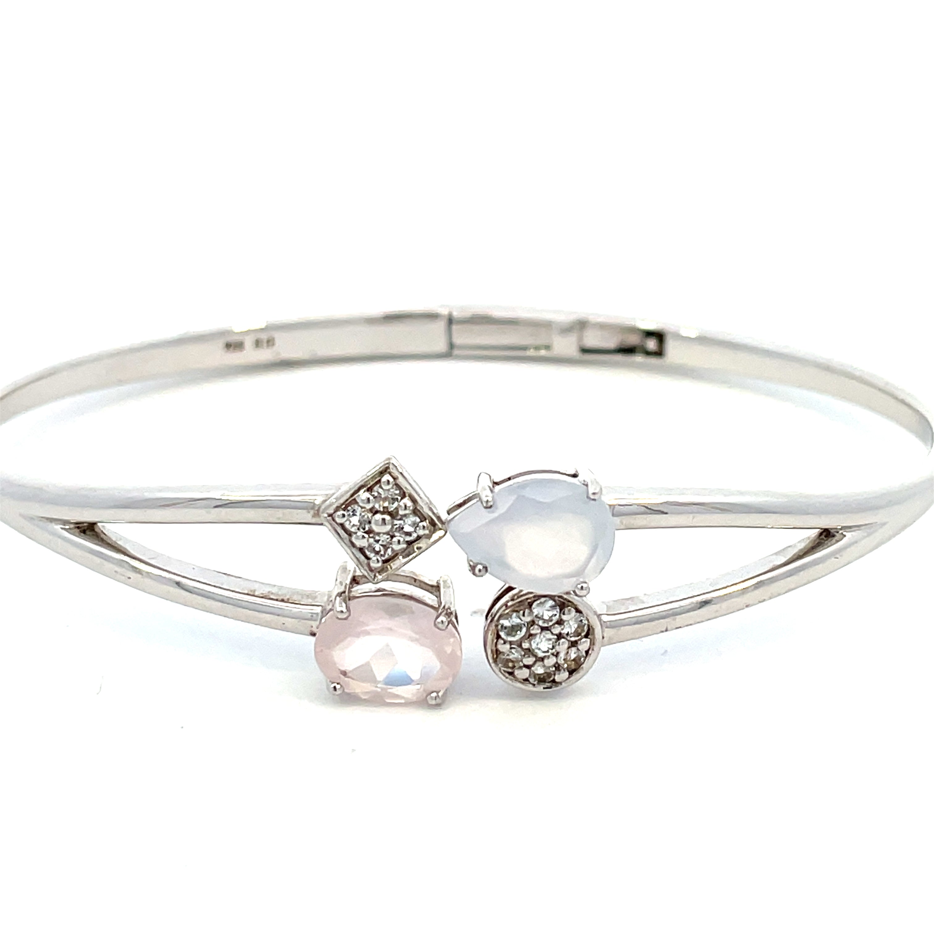 Expertly crafted with sterling silver, this hinged bangle bracelet features round white topaz and abstract cut pale pink stones. Get a touch of contemporary sophistication with this unique piece that is perfect for any occasion.