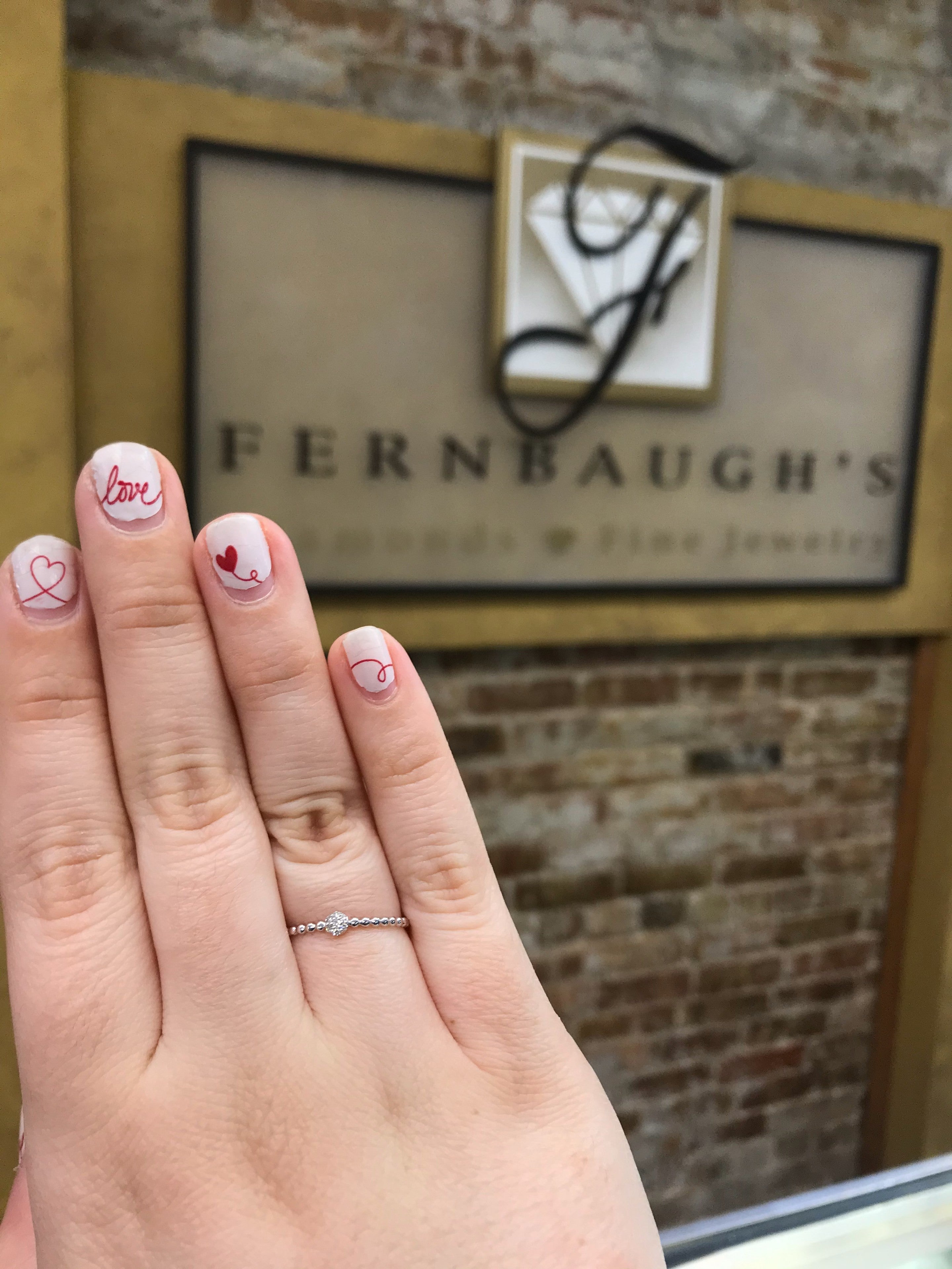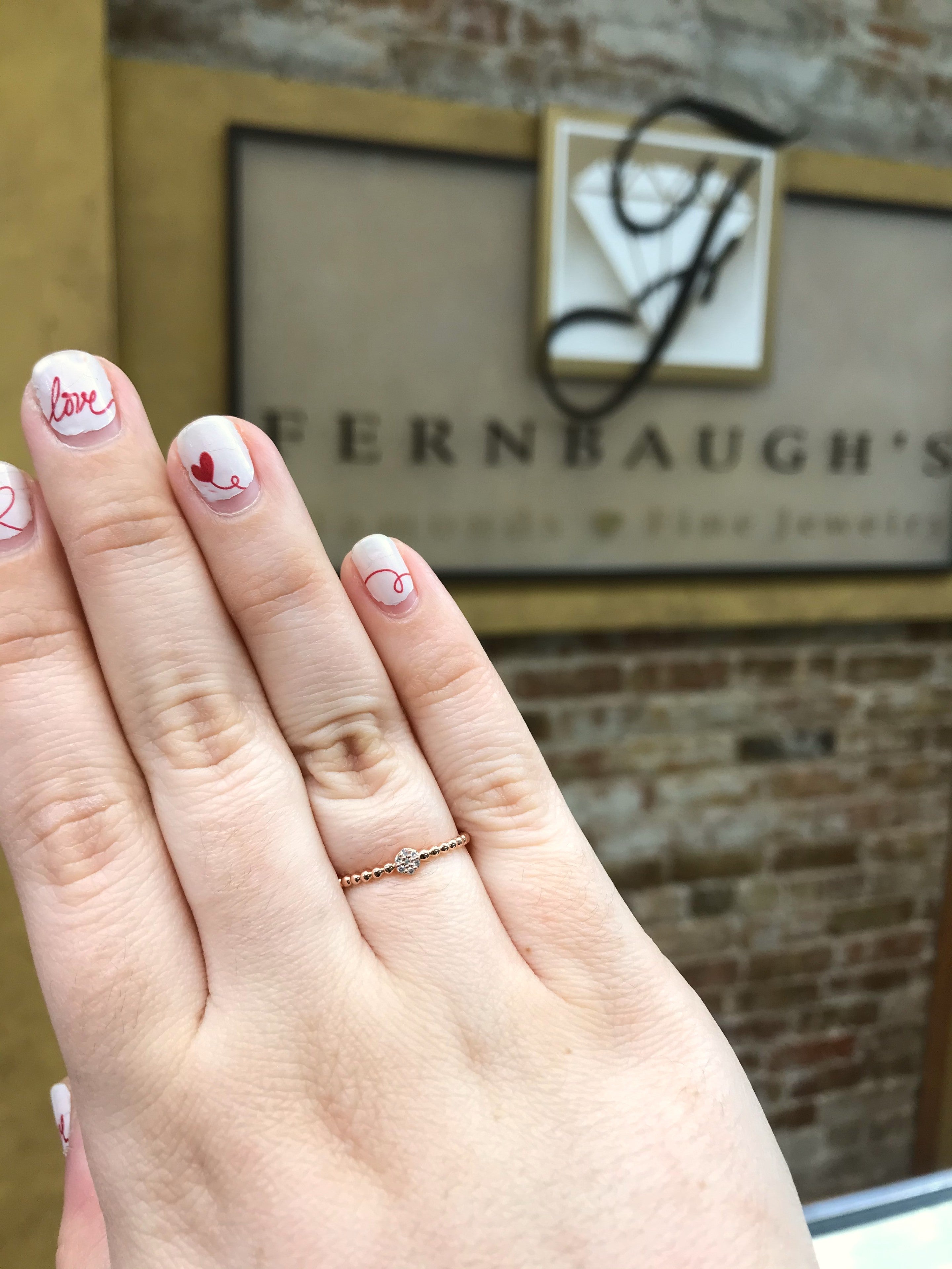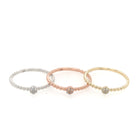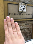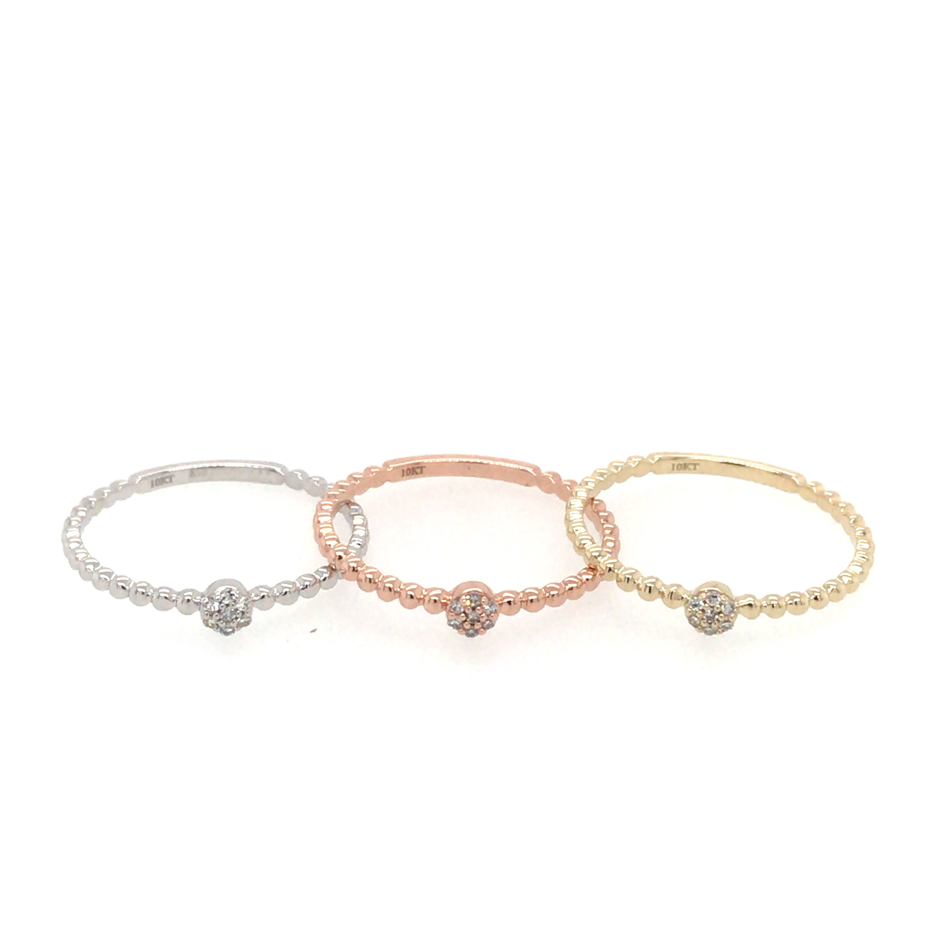 This dainty stackable ring is thoughtfully made in brightly polished 10 karat gold, fashioned into a super-chic beaded band with slim lines and a light-weight feel. A total of 0.02ctw carat of sparkling round brilliant cut diamonds are pave set into a petite circular cluster setting nestled in the center. Elevate your style with this beautiful diamond band that is perfect for stacking with other bands if desired. Diamond clarity is SI3, color G-H.