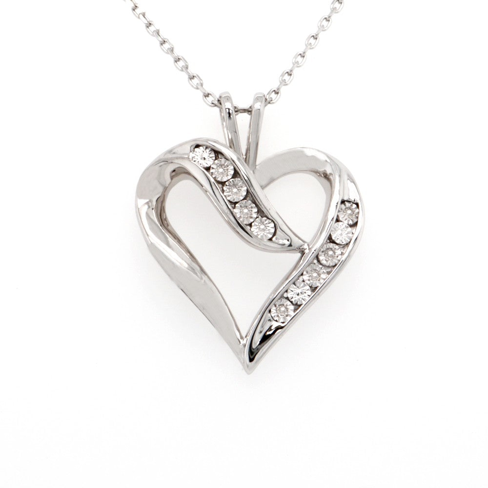 Created in sterling silver, this exquisite open heart diamond pendant features sparkling round brilliant cut diamonds that are expertly channel set, nestled in a graceful ribbon heart-shaped drop design. This gorgeous diamond heart pendant makes the ultimate anniversary or birthday gift, or a treat for someone who loves the timeless look of diamond heart jewelry.