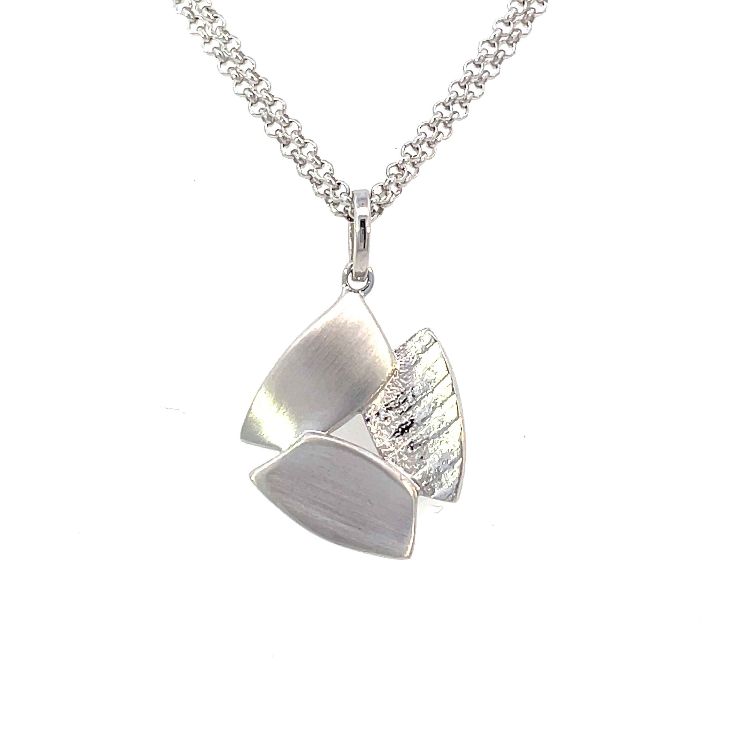 Expertly crafted from high-quality sterling silver, the AvaGray Three Oval Pendant showcases a unique abstract design that combines a brushed satin finish with a rough stone finish. This pendant hangs from a two-strand cable chain, making it both stylish and durable. Elevate any outfit with this stunning piece.
