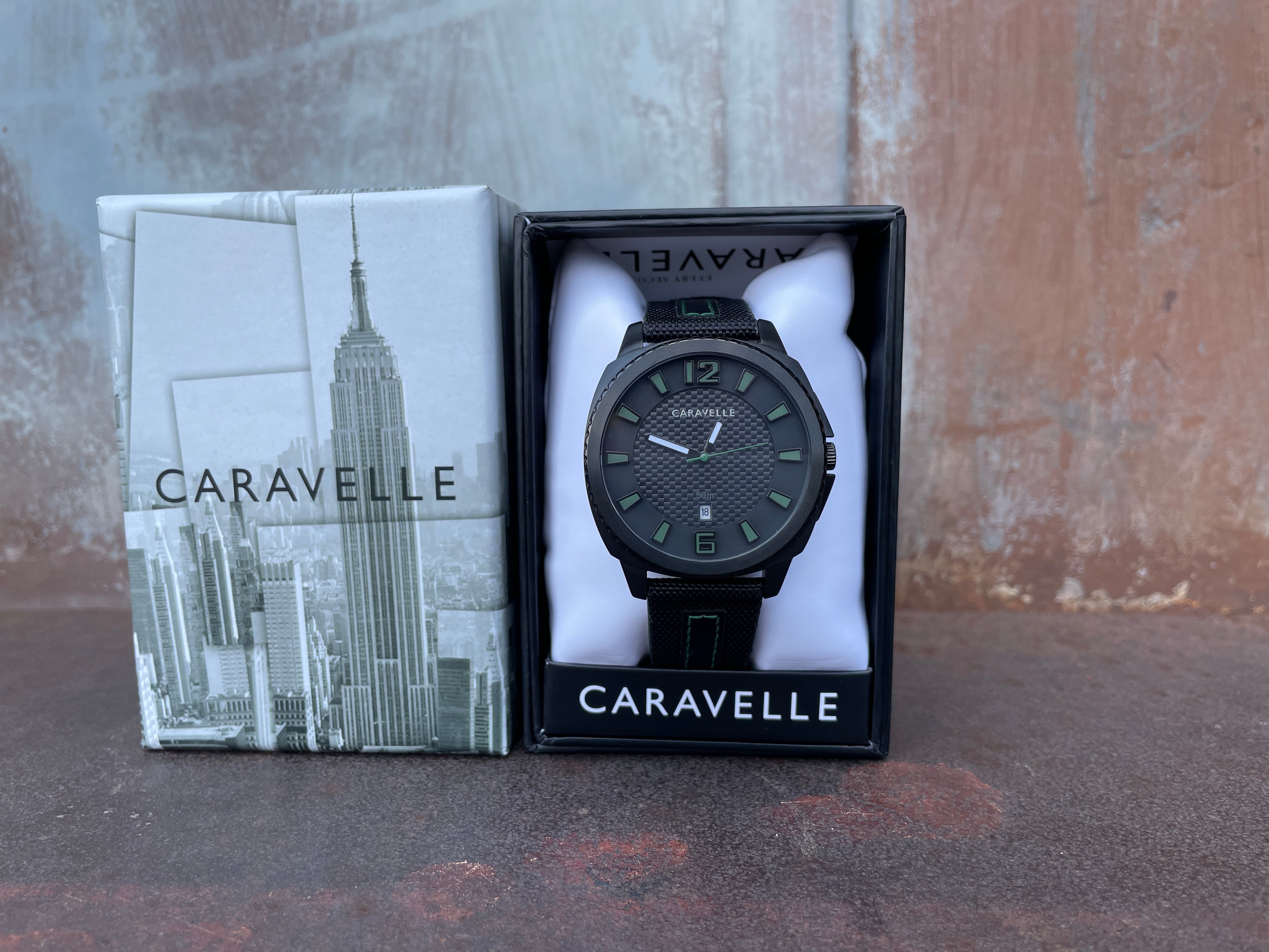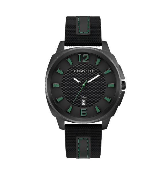 Expertly crafted, the Men's Caravelle by Bulova Watch with Black Face and Black Canvas & Leather Band from Fernbaugh's Jewelers exudes a rugged yet sophisticated style. With green stitching and markers, this watch offers a unique touch to its black face and sturdy canvas and leather band. Elevate your look with precision and style.