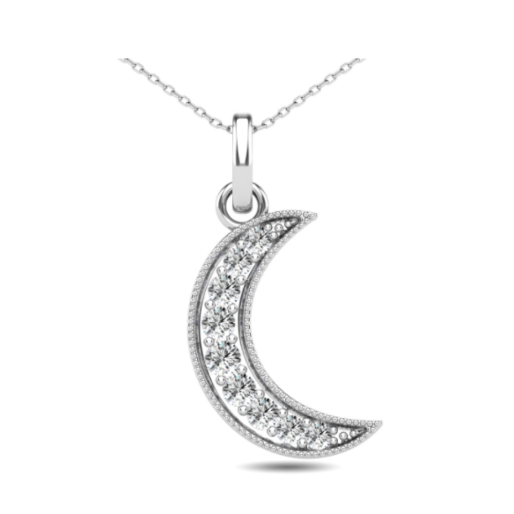 This crescent Moon pendant made in 10K white gold and this dainty moon drop features graduated-size diamonds of 1/10 Ct.Tw. This everyday jewelry adds the touch of sparkle to her look. The pendant suspends along an 18.0-inch chain that secures with a spring-ring clasp.