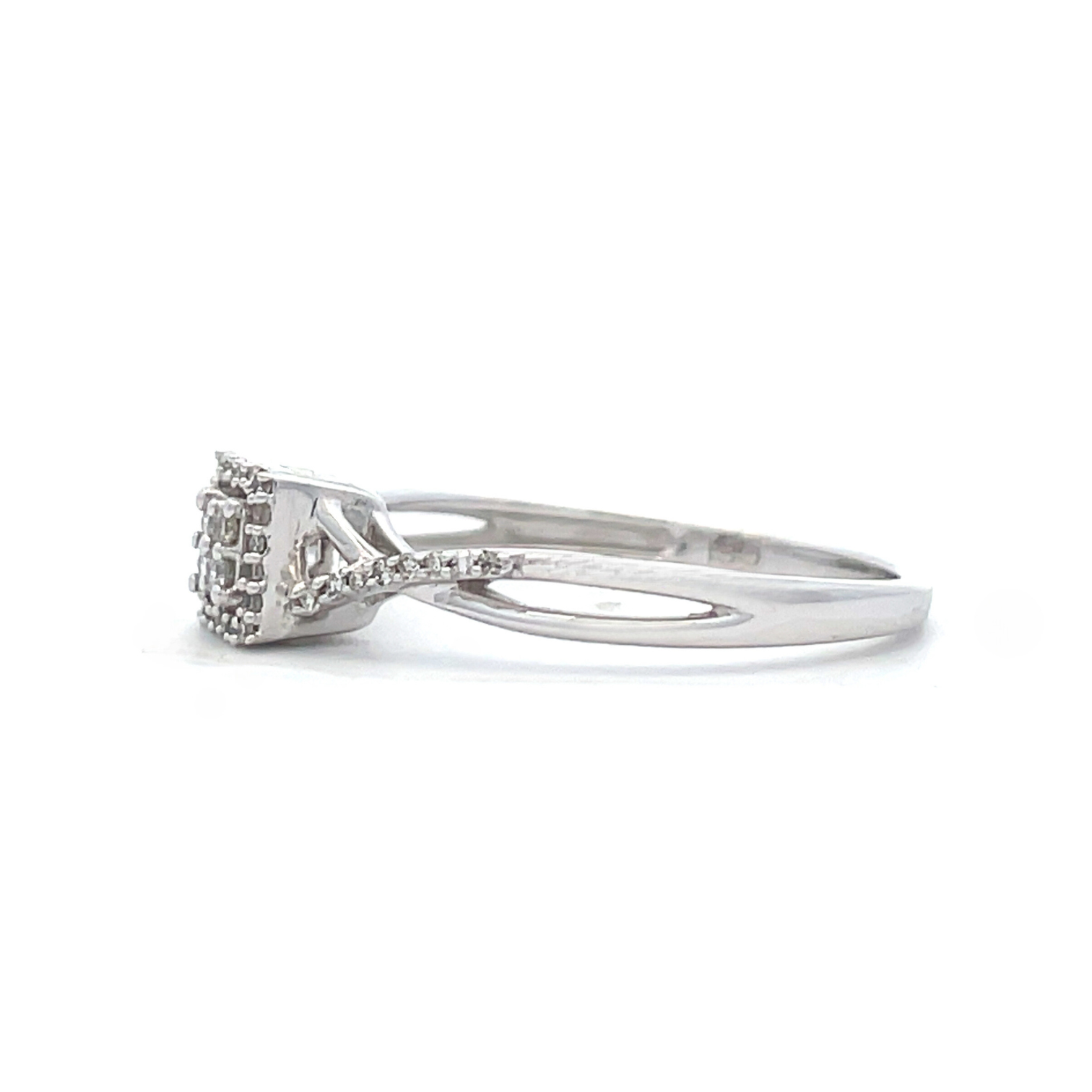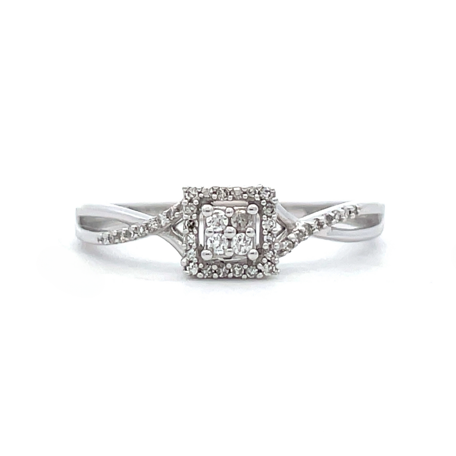 This beautiful ring features 1/10 carat total weight of round brilliant cut diamonds arranged in a Princess (square) shaped cluster center with a square halo. More diamonds dot the twisted shank.