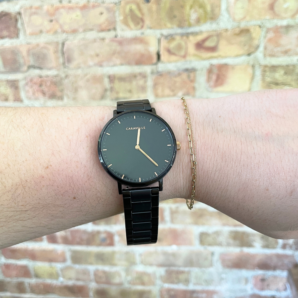 Enhance your style with the Caravelle by Bulova Black Tone Watch. This watch features a 36mm face, stainless steel design, and quartz movement for accuracy. The rose gold tone markers add a touch of sophistication, while the bracelet band ensures a secure and comfortable fit. Elevate your look with this timeless timepiece.