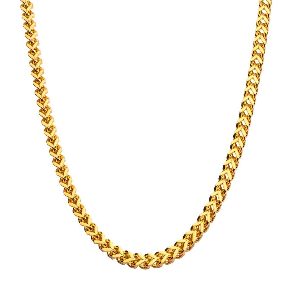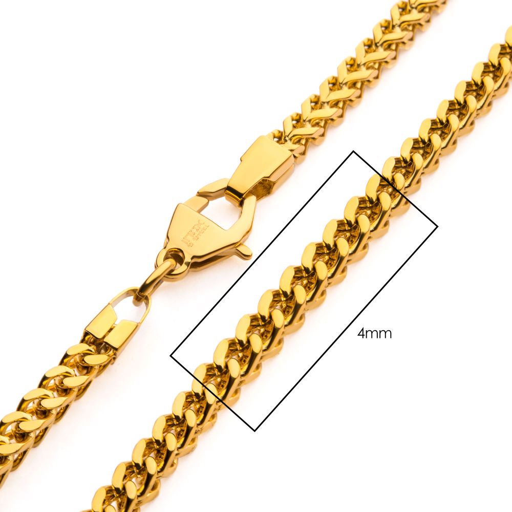 Expertly crafted and designed, our Franco chain necklace is made of stainless steel with a beautiful 18 karat gold overlay. This necklace boasts a sleek and stylish Franco chain design, measuring 24 inches in length and 4mm thick. Elevate any outfit with this timeless piece from Fernbaugh's Jewelers.