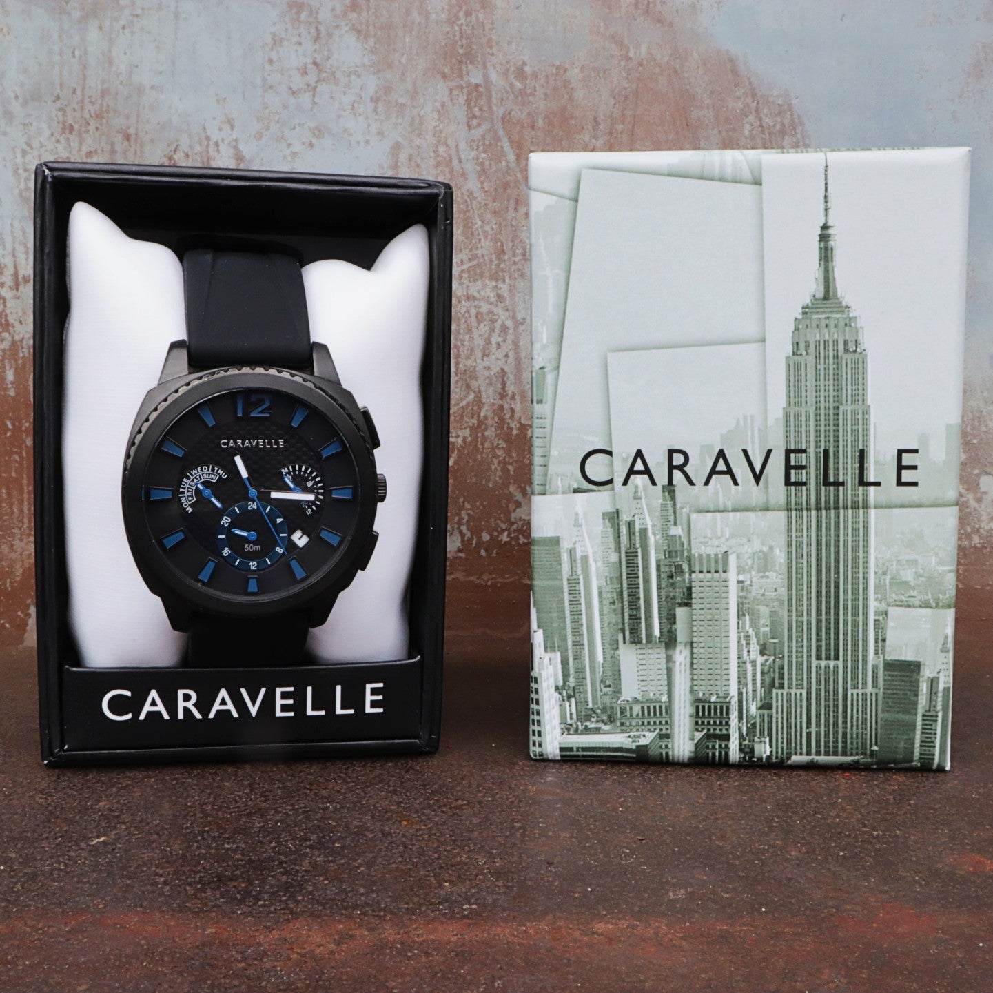 Men's Caravelle by Bulova Watch with Black Face, Blue Markers and Black Silicone Band