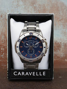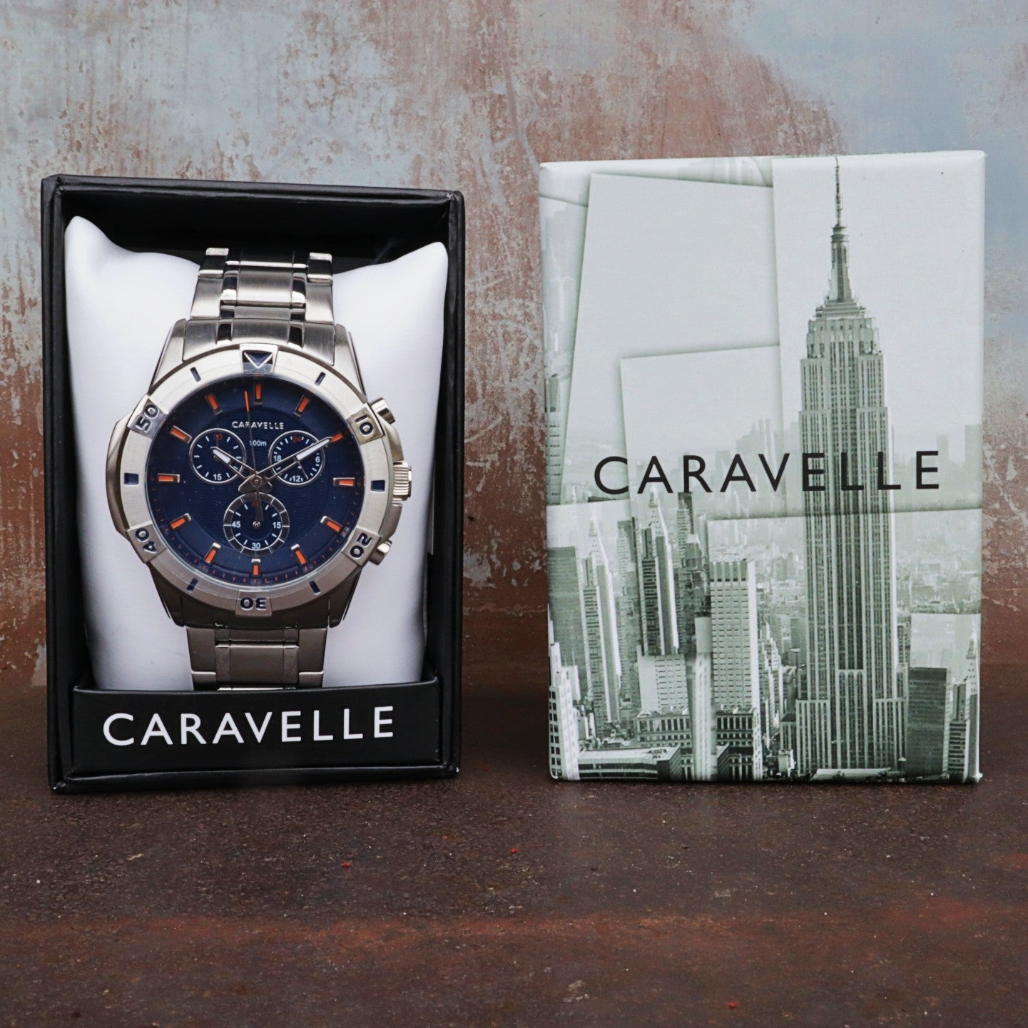 This sporty, but functional, watch would make the perfect gift for dads, grads, groomsmen and more! Features include quartz movement, glow-in-the-dark hour & minute hands and chronograph, and contrasting orange markers that pop off the blue face making it easy to read. Its white stainless steel case features a brush finish and high polish details. Quartz movement. This watch is part of our Caravelle line made by Bulova.