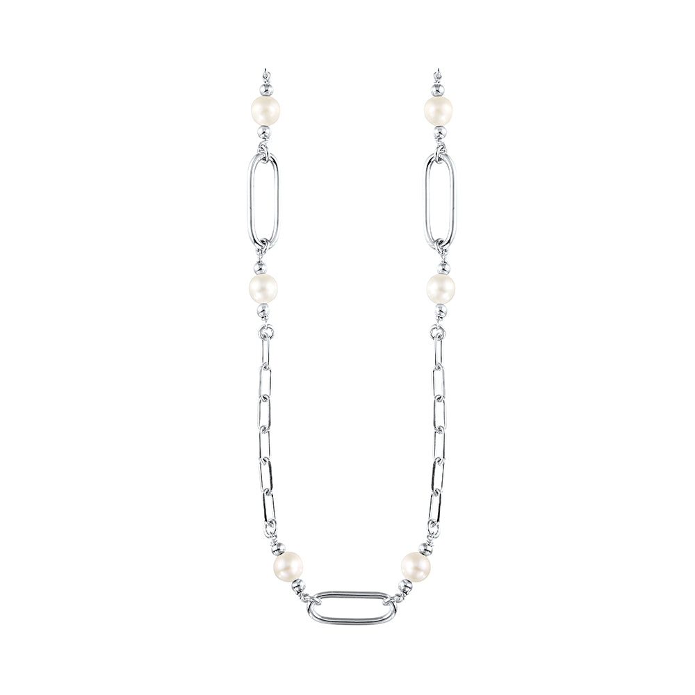A combination of classic and modern, this sterling silver necklace is the perfect addition to you jewelry wardrobe! Trendy paperclip links are mixed with larger oval open links and pearls in an alternating pattern.