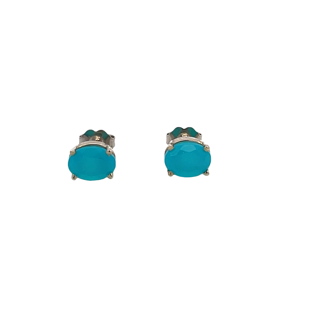 These exquisite blue chalcedony stud earrings are the perfect blend of simplicity and elegance. Crafted with precision, the blue chalcedony  stones are set in a sleek white gold setting, making them ideal for both casual and formal occasions. Add a pop of color to your ensemble with these timeless pieces.