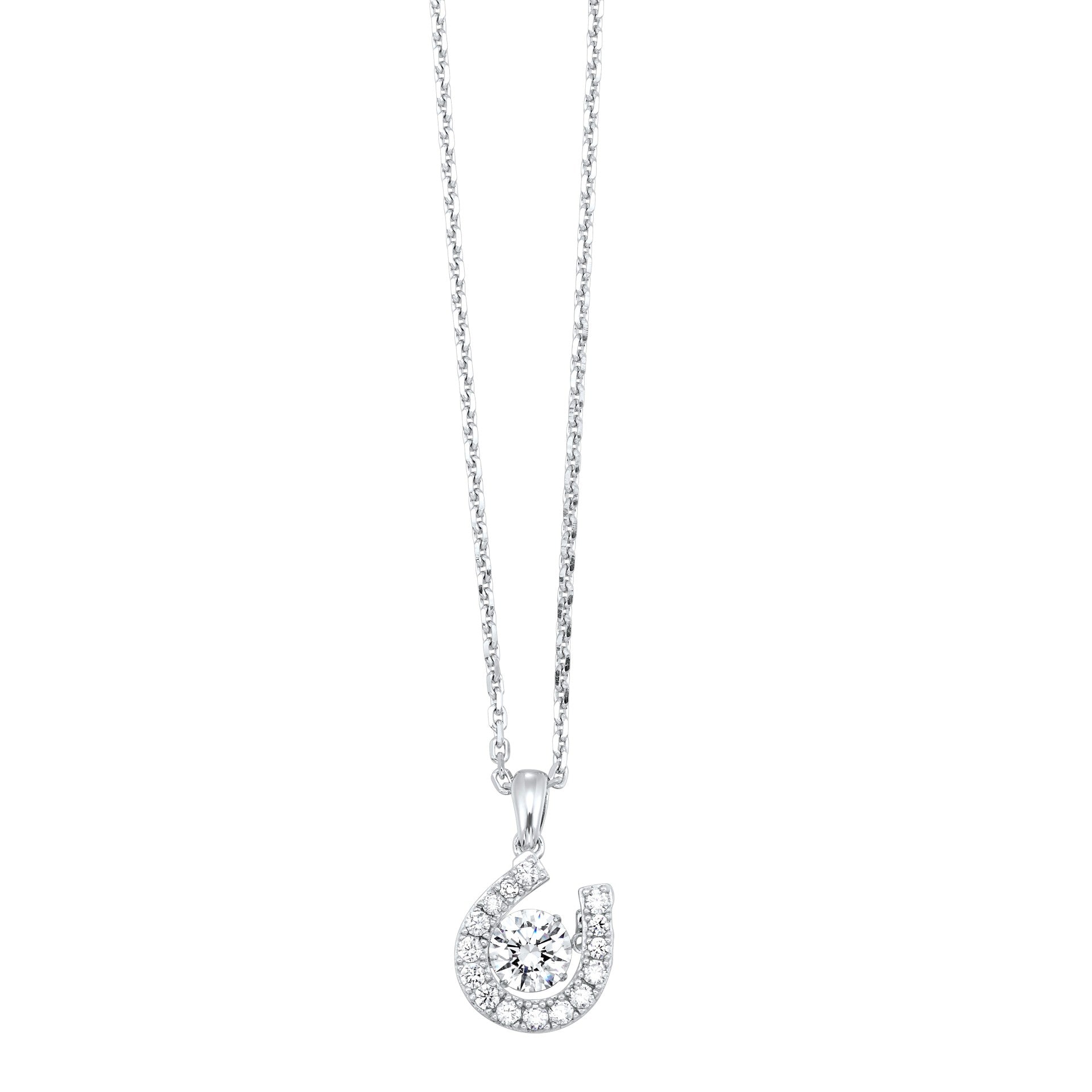 Calling all horse lovers, this necklace is the perfect piece for you! This sterling silver pendant is shaped like a horseshoe and glitters with sparkling white CZ stones. One center stone is nestled into the curve of the horseshoe.