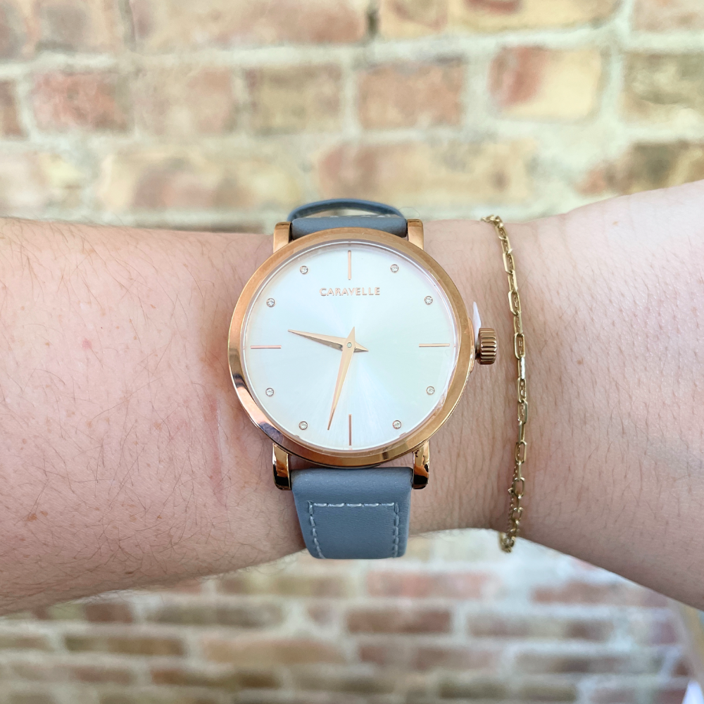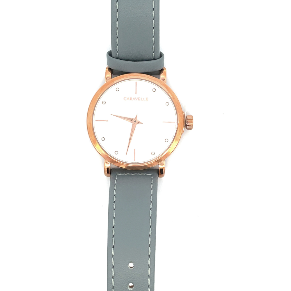Experience elegance and style with the Caravelle by Bulova Rose Gold Tone Watch. The 36mm face and white dial create a timeless look, while the rose tone case and markers add a touch of luxury. The soft blue-gray leather band provides comfort and durability. Elevate your style with this stunning timepiece.