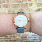 Caravelle by Bulova Rose Gold Tone Watch with White Face and Blue Leather Band | Fernbaugh's Jewelers