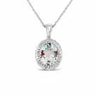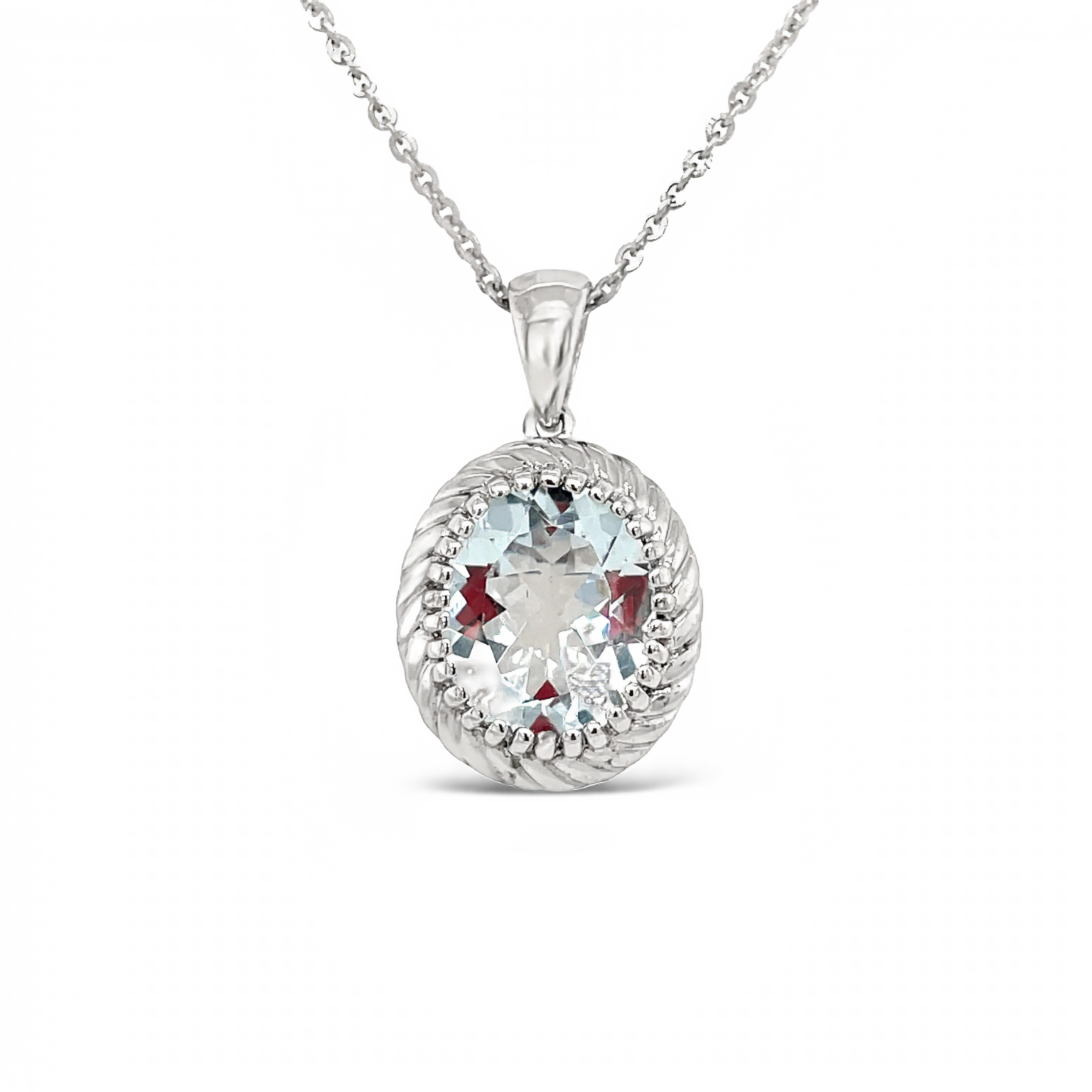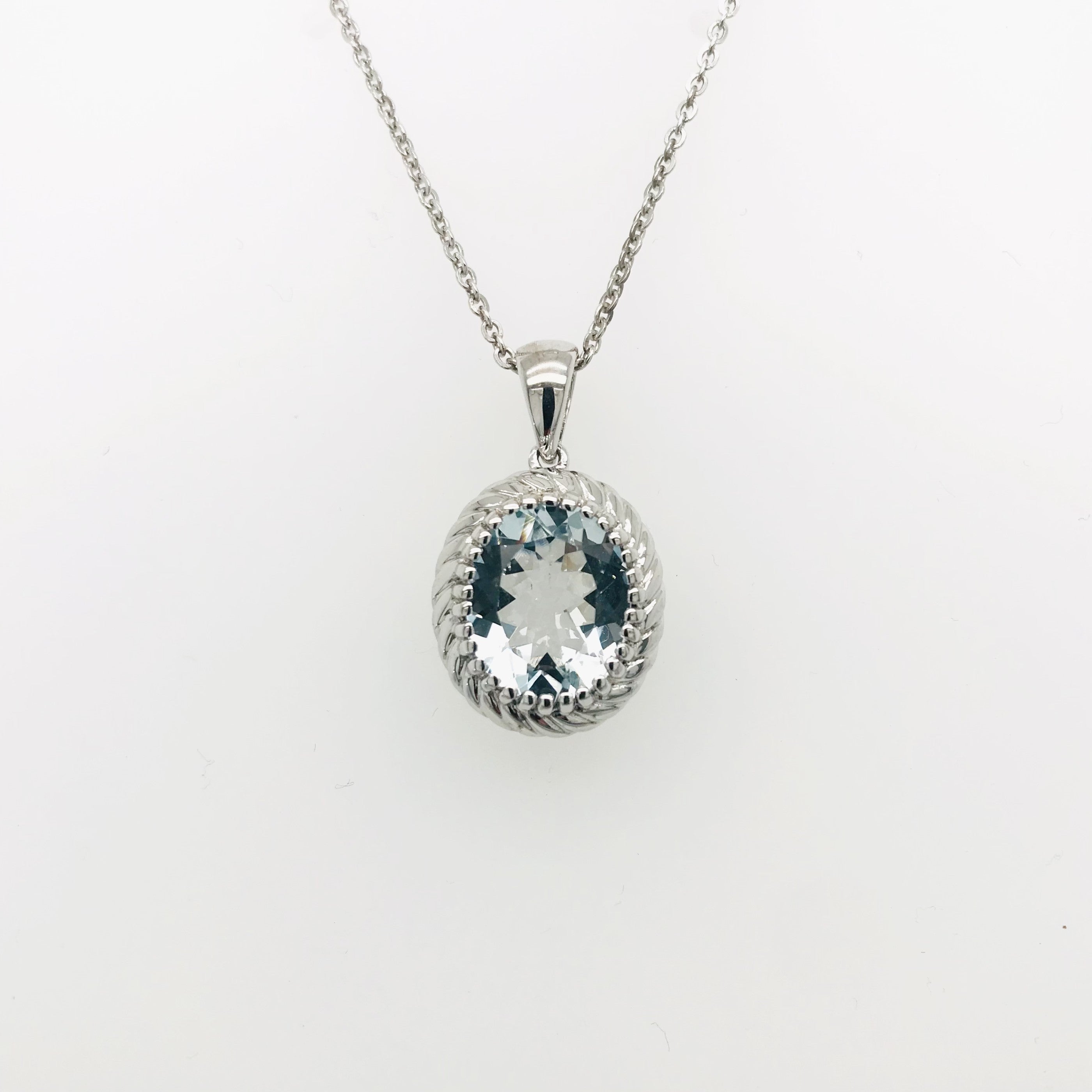 This eye-catching Aquamarine pendant is sure to make a statement! This pendant boasts a 5.80 carat oval cut Aquamarine bezel set in sterling silver. Features twist detailing on the front and filigree cut outs on the back to let the light in and show off the beautiful facets of the stone. This pendant also has a matching ring which is sold separately.