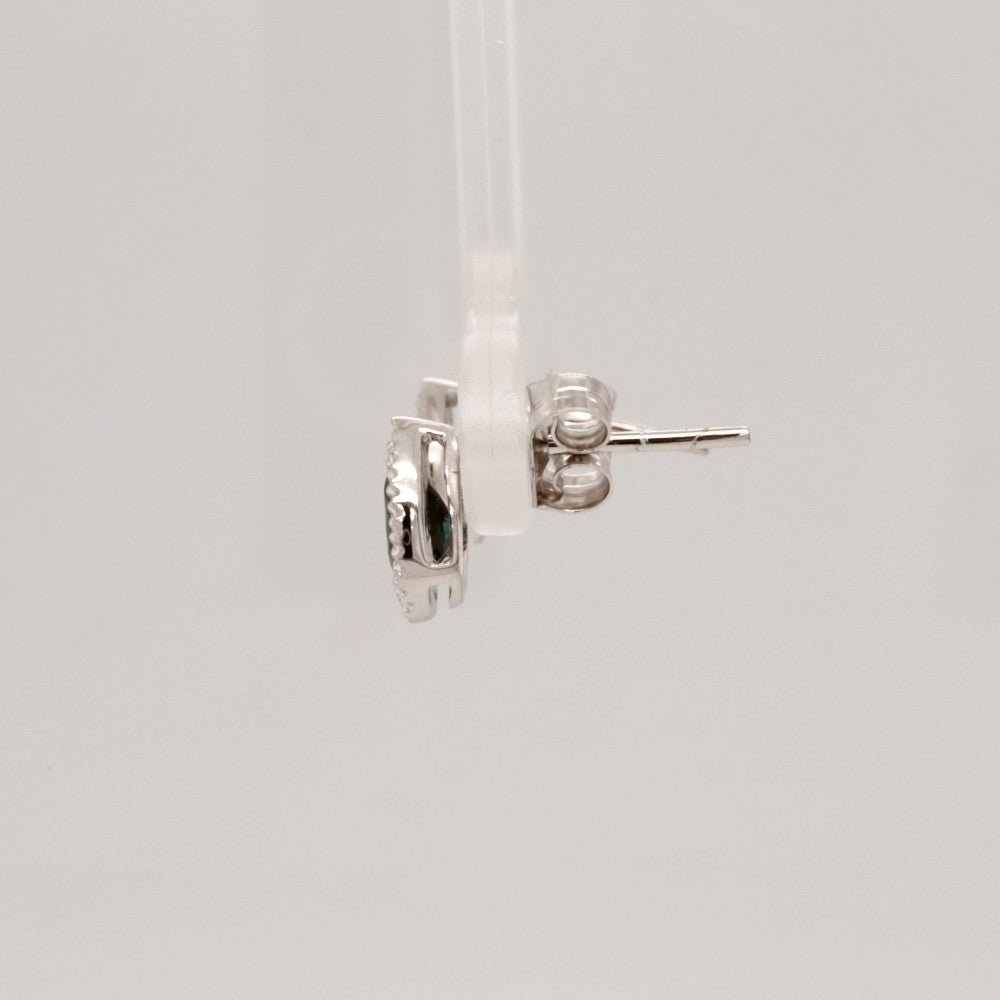Classic and timeless, these blue sapphire stud earrings would make the perfect gift for any occasion. Set in sterling silver with a diamond halo. Traditional friction posts and backs. A matching necklace is also available.