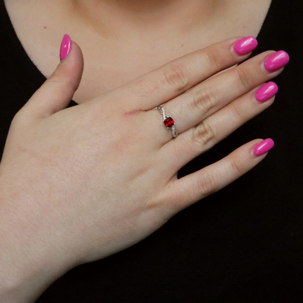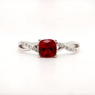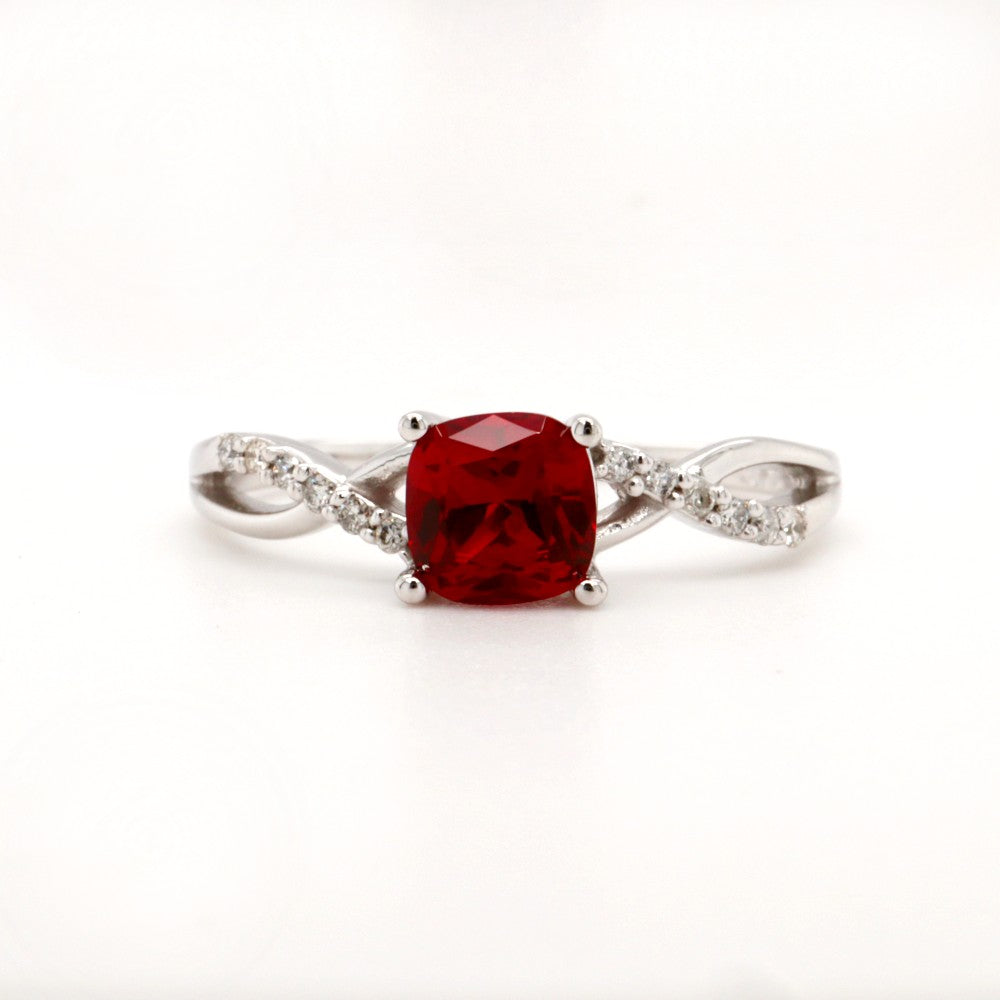 What better way to show your love than with red, the color of passion, love and life. This solid 10 karat white gold ring features a cushion cut lab created ruby with .06 carat total weight of accent diamonds on the twisted shank.