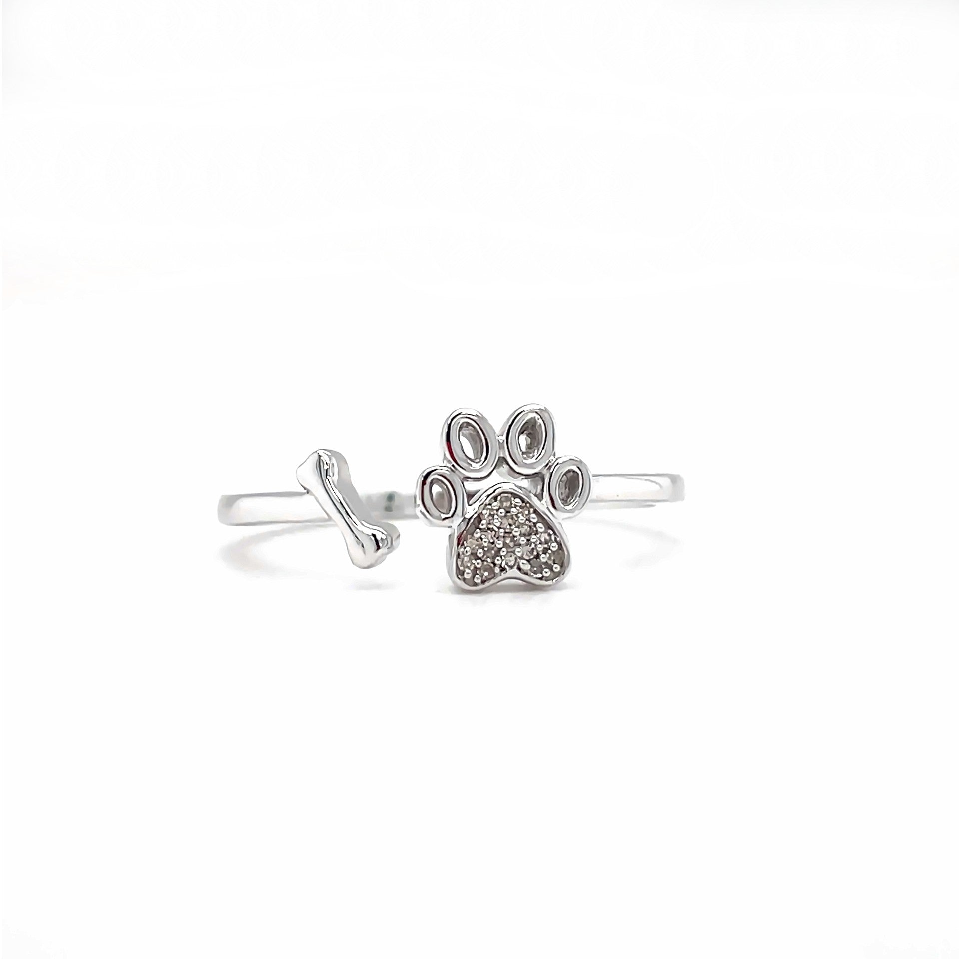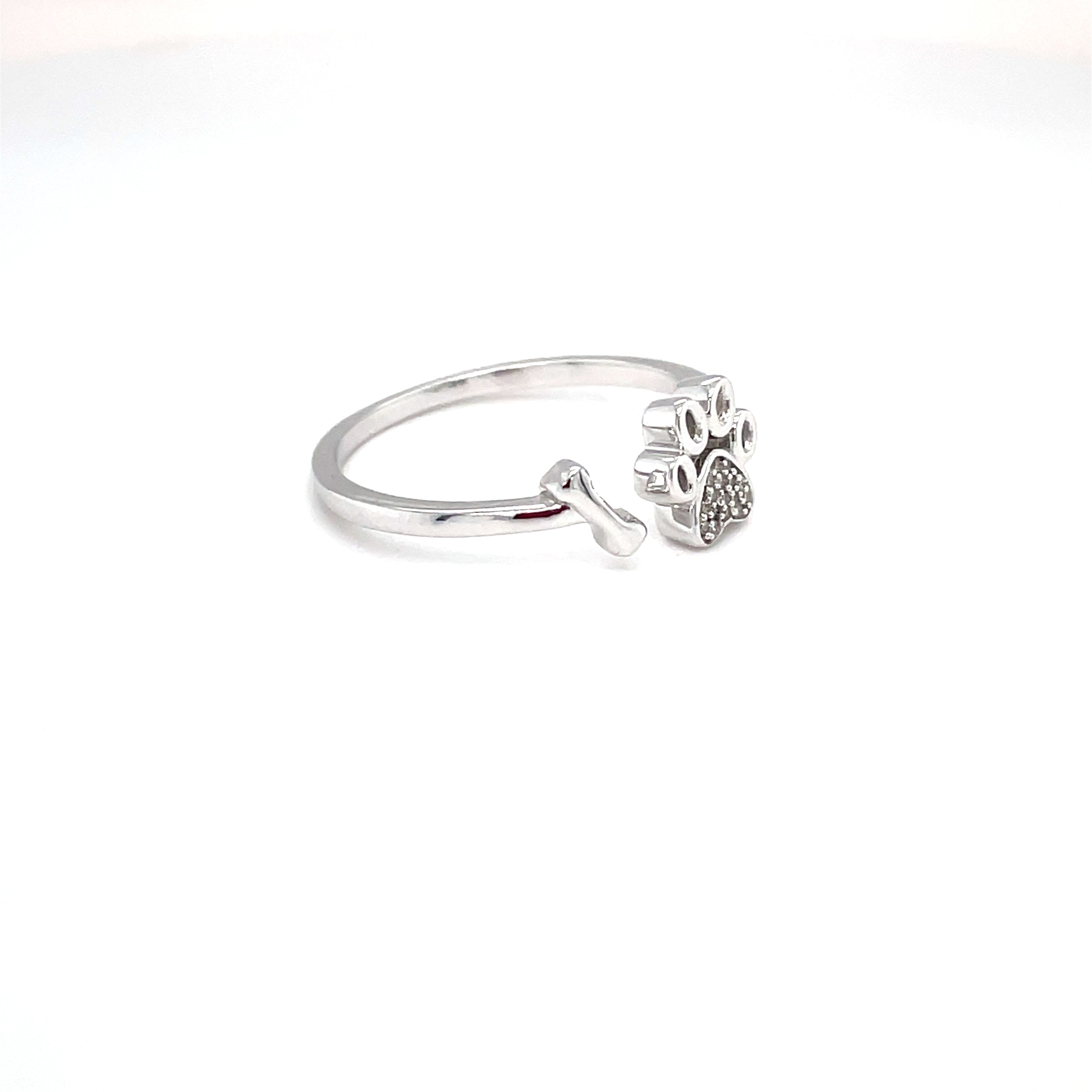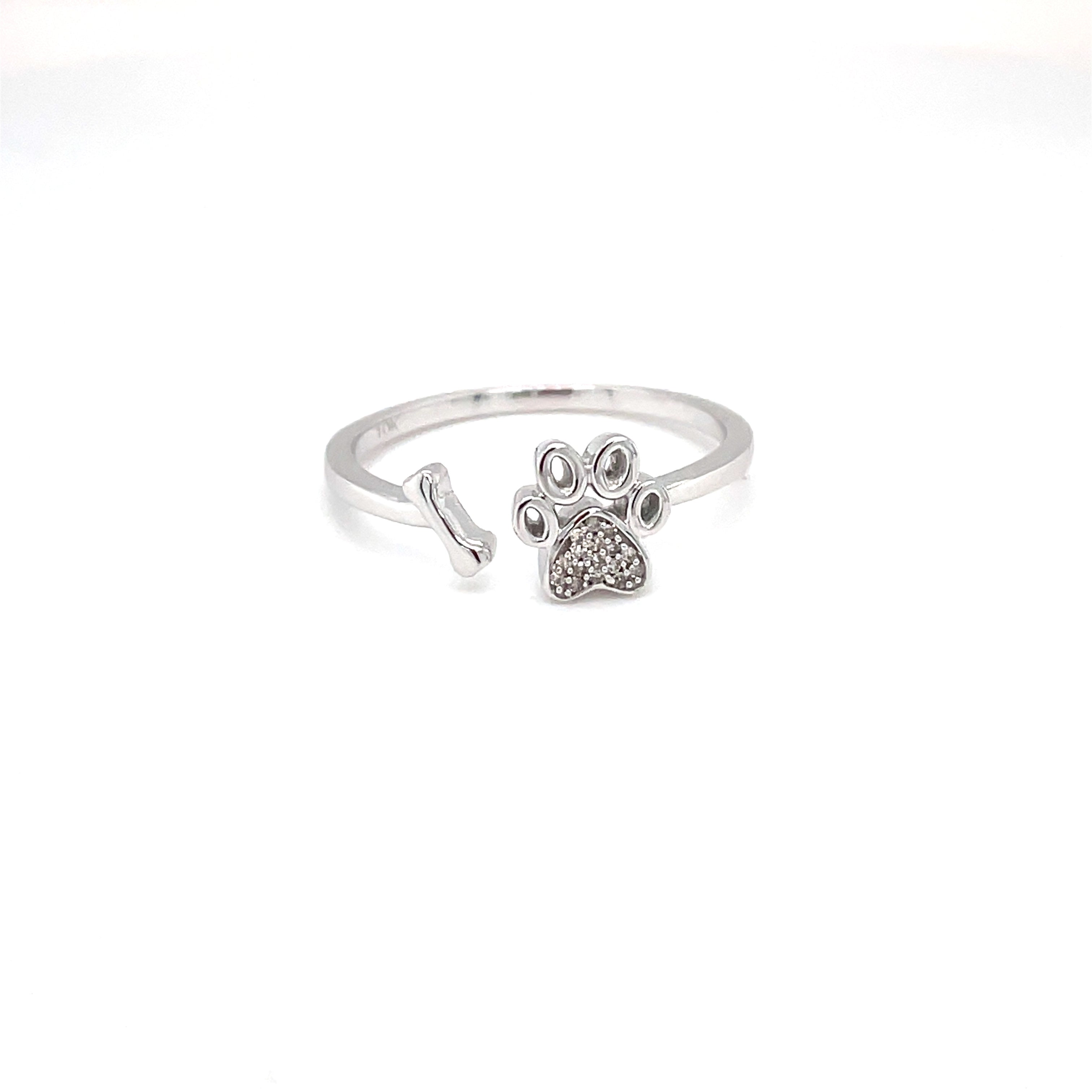Show off your love of dogs in style with this adorable fashion ring. This open ring features a pawprint and dog bone design crafted of high polish 10 karat white gold. The pawprint is set with .08 carat total weight of diamonds. Finger size 7, can be sized or ordered in your finger size.