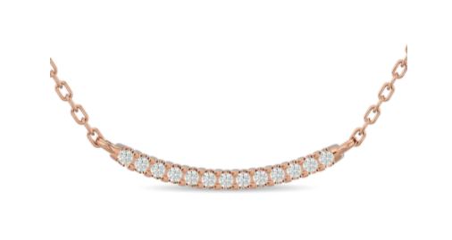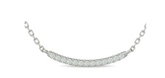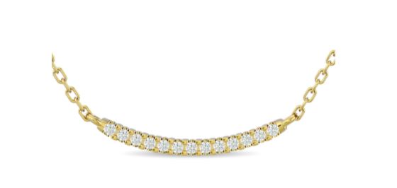 Make her smile with this 10 karat gold and diamond "Smile" bar pendant. Featuring 1/6 carat total weight of diamonds set on a curved bar. An 18 inch cable chain is attached to either side of the bar and closes with a lobster clasp.