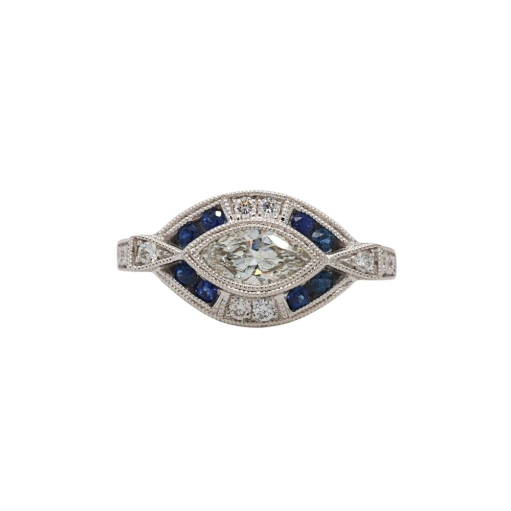 This stunning ring is sure to make a statement. Featuring a .40 carat marquise cut center diamond set east-west and surrounded by a halo of diamonds and blue sapphires. This ring would make a great fashion ring or even an engagement ring! Diamond accents way up to .21 carat total weight for a diamond total weight of .61 carats. .16 carat total weight of blue sapphires. Finger size 7 but can be sized.