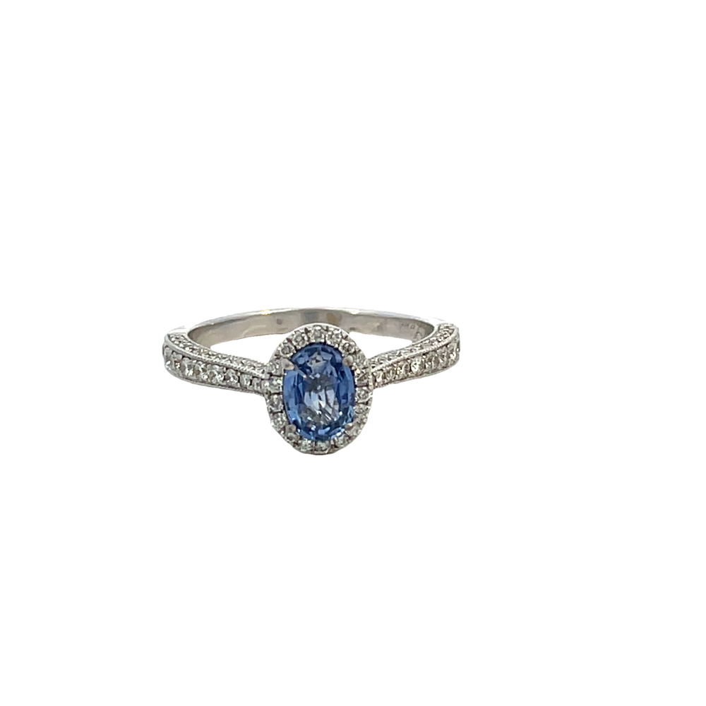 This white gold ring features a stunning ceylon oval sapphire, elegantly framed by a halo of sparkling diamonds. The band, encrusted with additional diamonds, enhances the ring's luxurious appeal, making it a perfect choice for those seeking timeless elegance and sophistication.