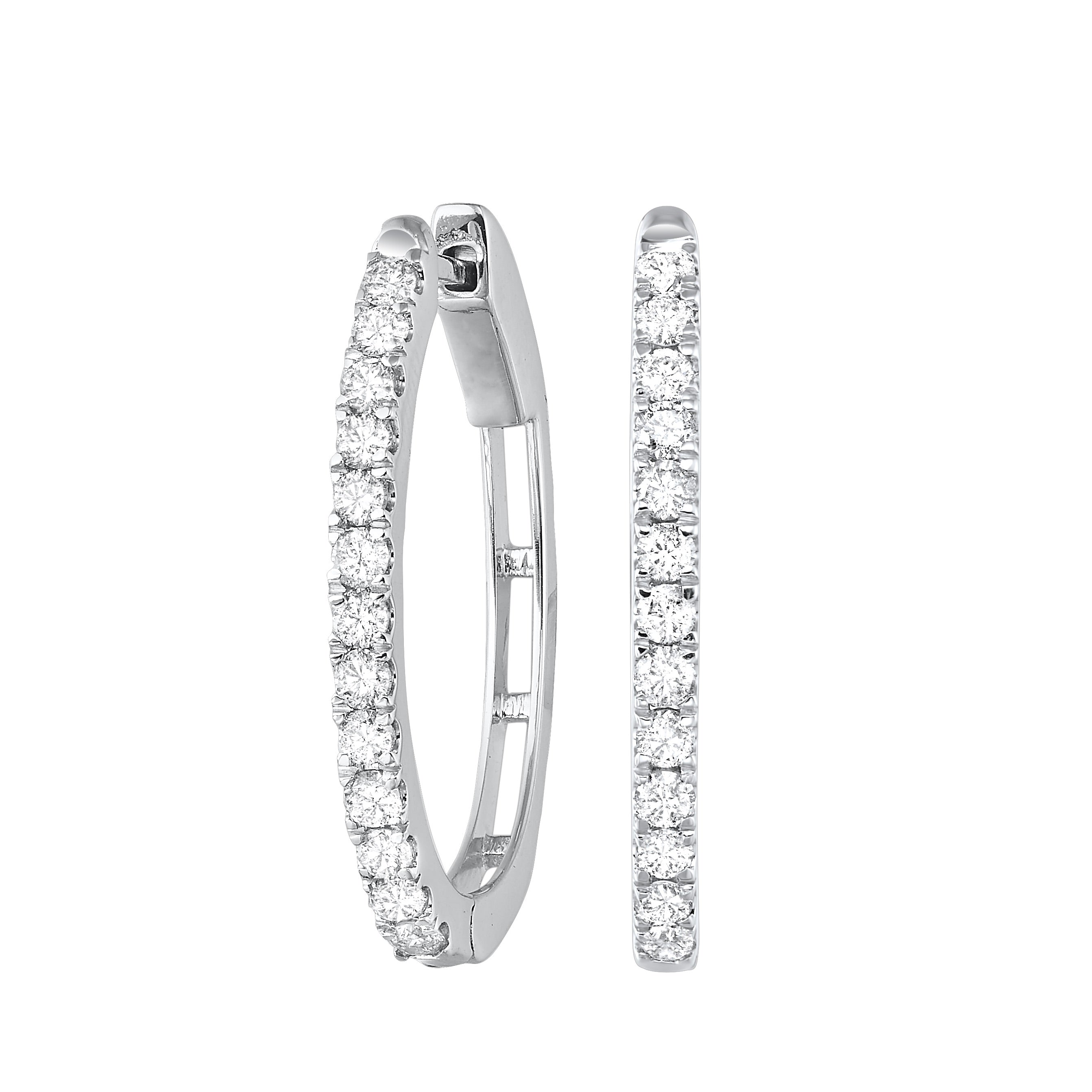 Diamond hoops are a classic for a reason. They match everything! So why not add a pair to your jewelry wardrobe! These gorgeous hoops feature your choice of 1/4, 1/2 or 1 carat total weight set in 14 karat white gold. Hinge closure.