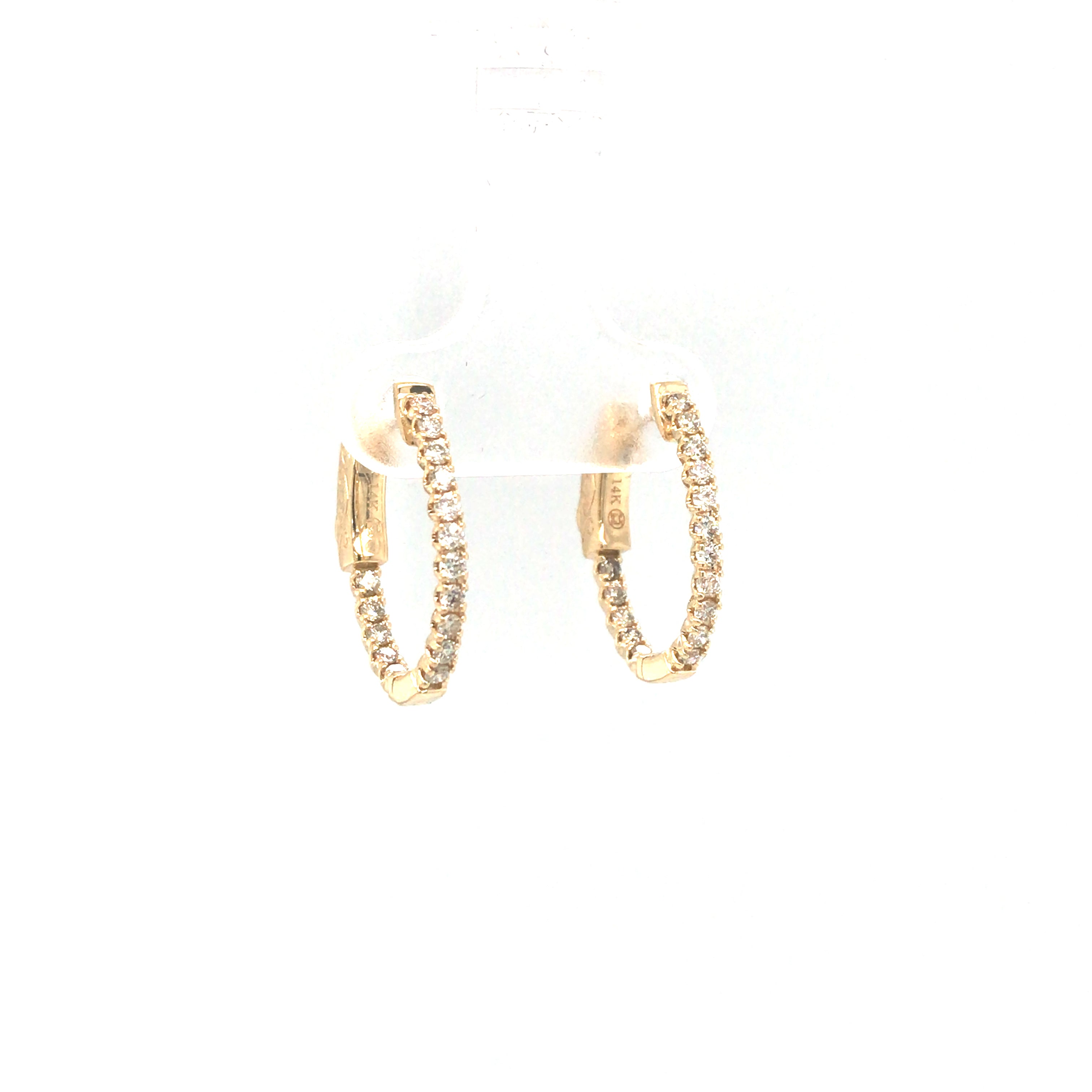 A timeless classic, these 14 karat yellow gold and diamond hoops would make the perfect addition to any jewelry wardrobe. These oval shaped hinged hoops are studded inside and out with your choice of 3/4 carat or 1/2 carat of sparkling round diamonds. They have a locking closure for added security.