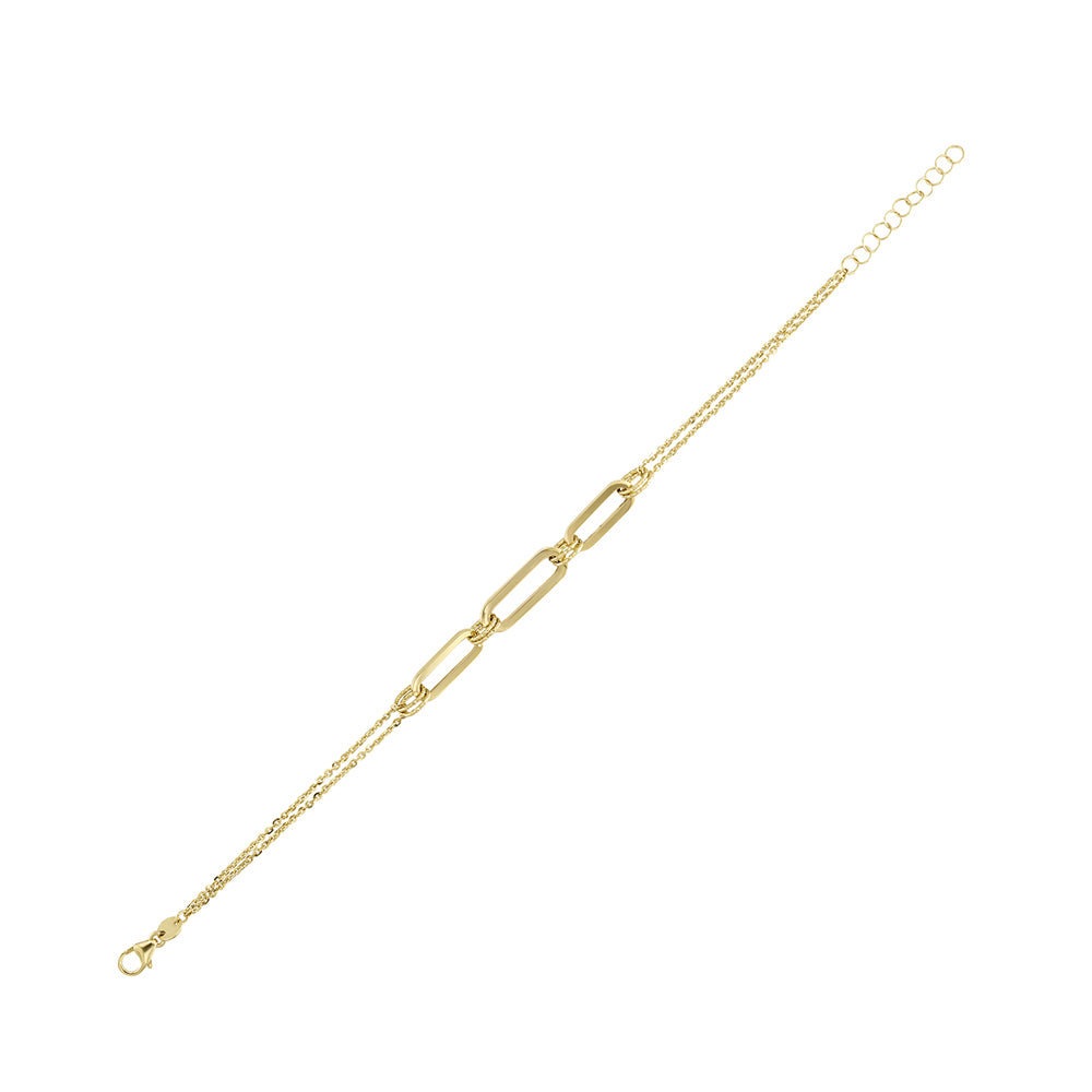 This 14 karat yellow gold bracelet is a perfect combination of classic and modern. Two strands of classic diamond cut cable chain are attached to three paperclip links on either side. Features a lobster clasp and is adjustable in length.