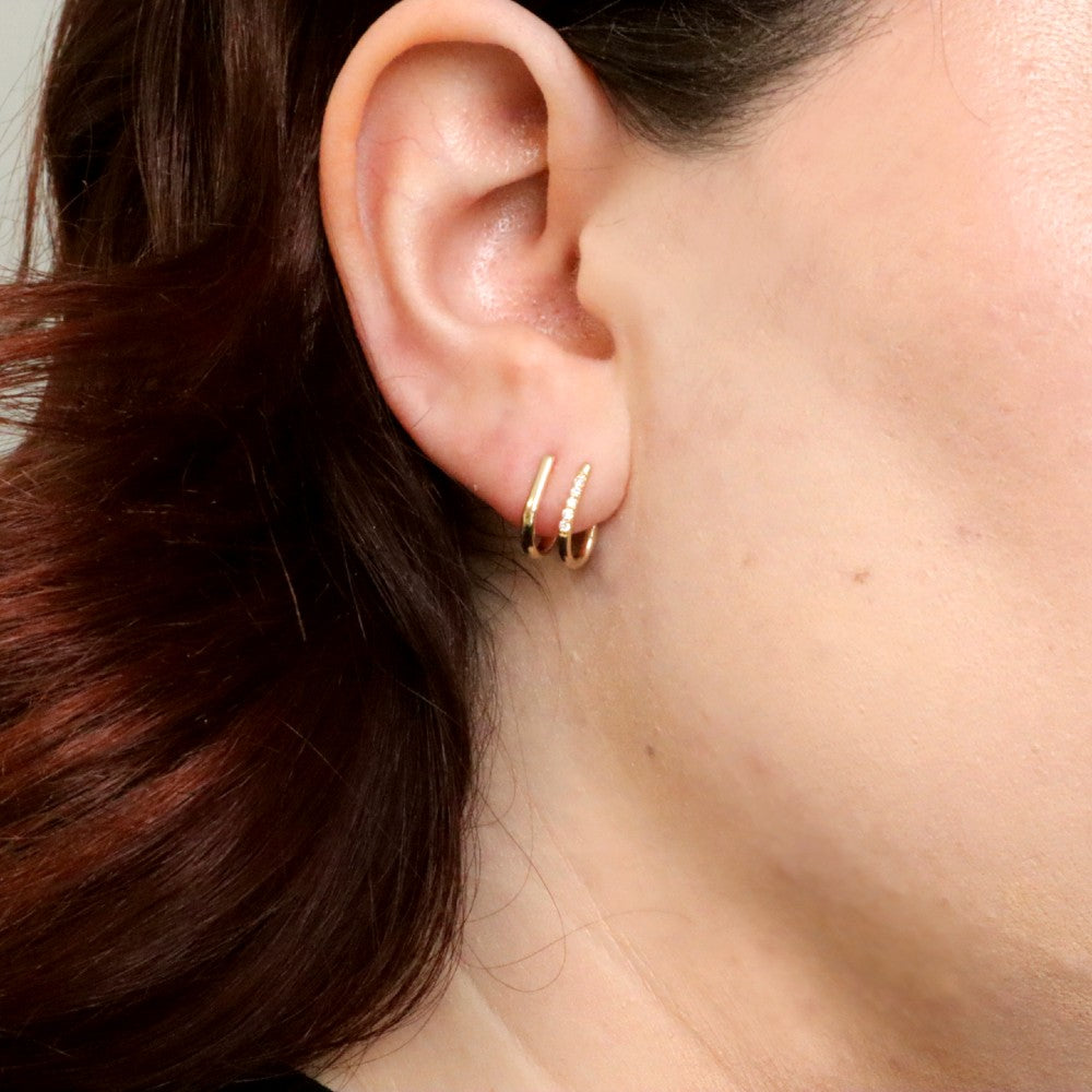 How cool are these open huggie hoops? Gives the look of a double ear piecing without the commitment! Made of solid 14 karat yellow gold with 5 diamonds on each earring for 1/15 carat total weight. Friction post and backs.