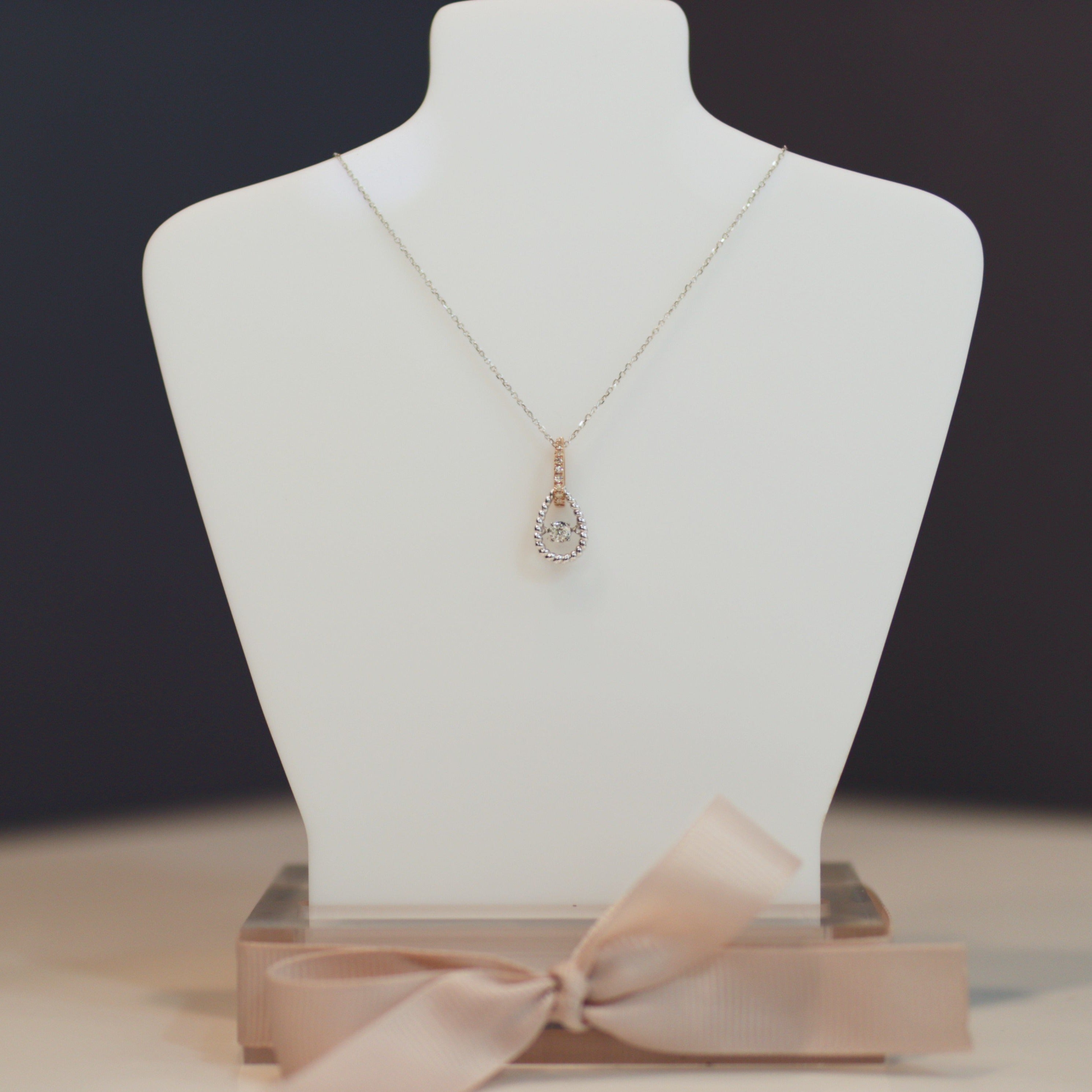 A twisted rope design takes center stage on this contemporary door knocker style pendant that is elegantly crafted in brightly polished 14k two-tone gold. A total of 1/10 carat of sparkling round brilliant cut diamonds set on the curved bail with a diamond solitaire suspended in the center. A sturdy rolo link chain is threaded through the bail, making this gorgeous diamond pendant ready for gifting. Diamond clarity is I1-I2, color G-H.