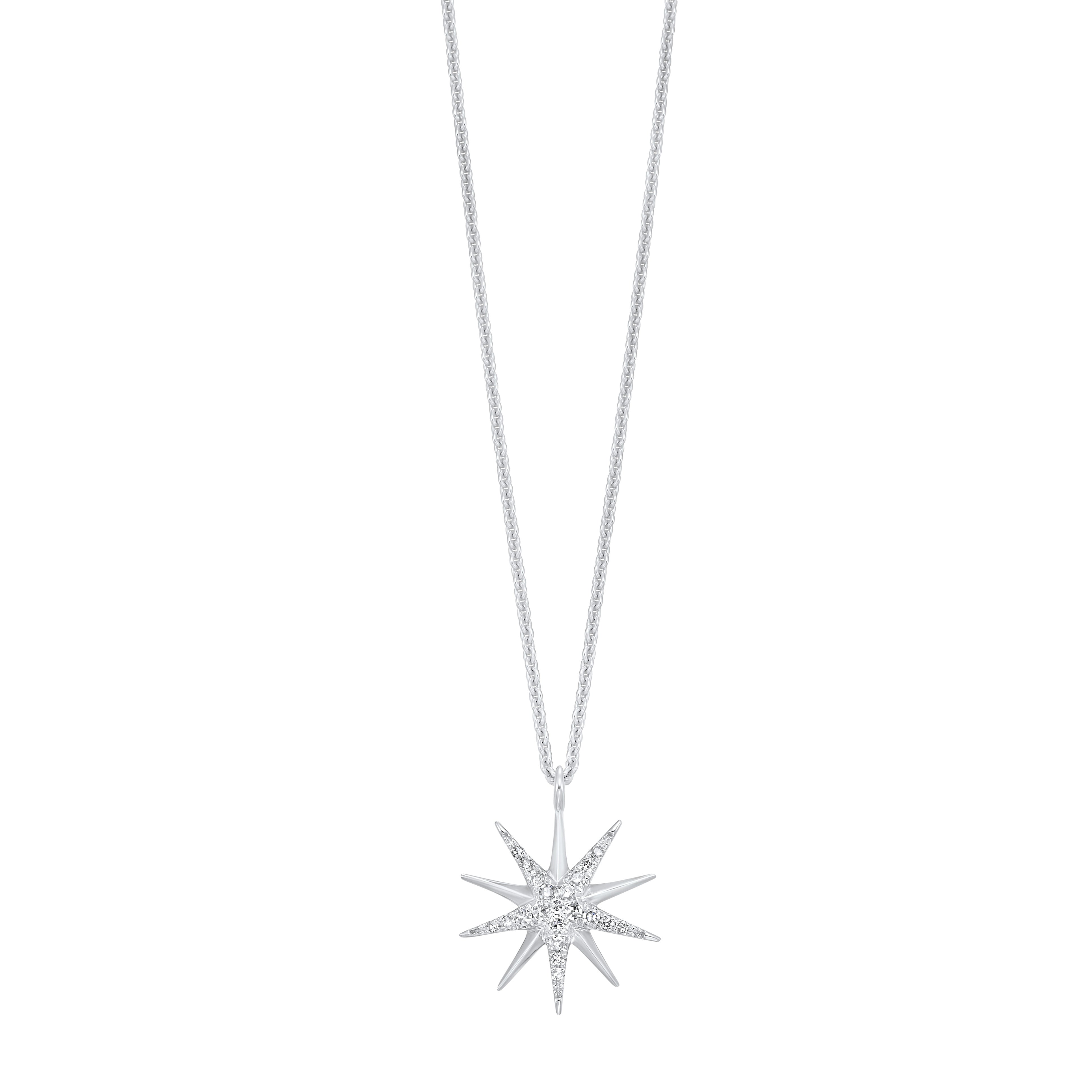 This starbust shaped pendant features 1/10 carat total weight of diamonds set in sterling silver and would make a stylish addition to your every day wear.