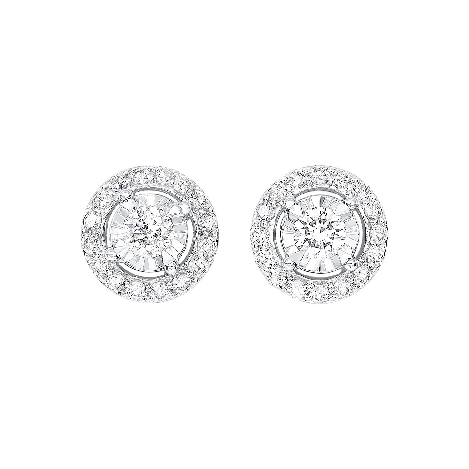 Really wow her with these dazzling diamond earrings. Features one round brilliant cut diamond prong set surrounded by a round diamond halo. Set in high polish 14 karat white gold. Available in several carat total weights.