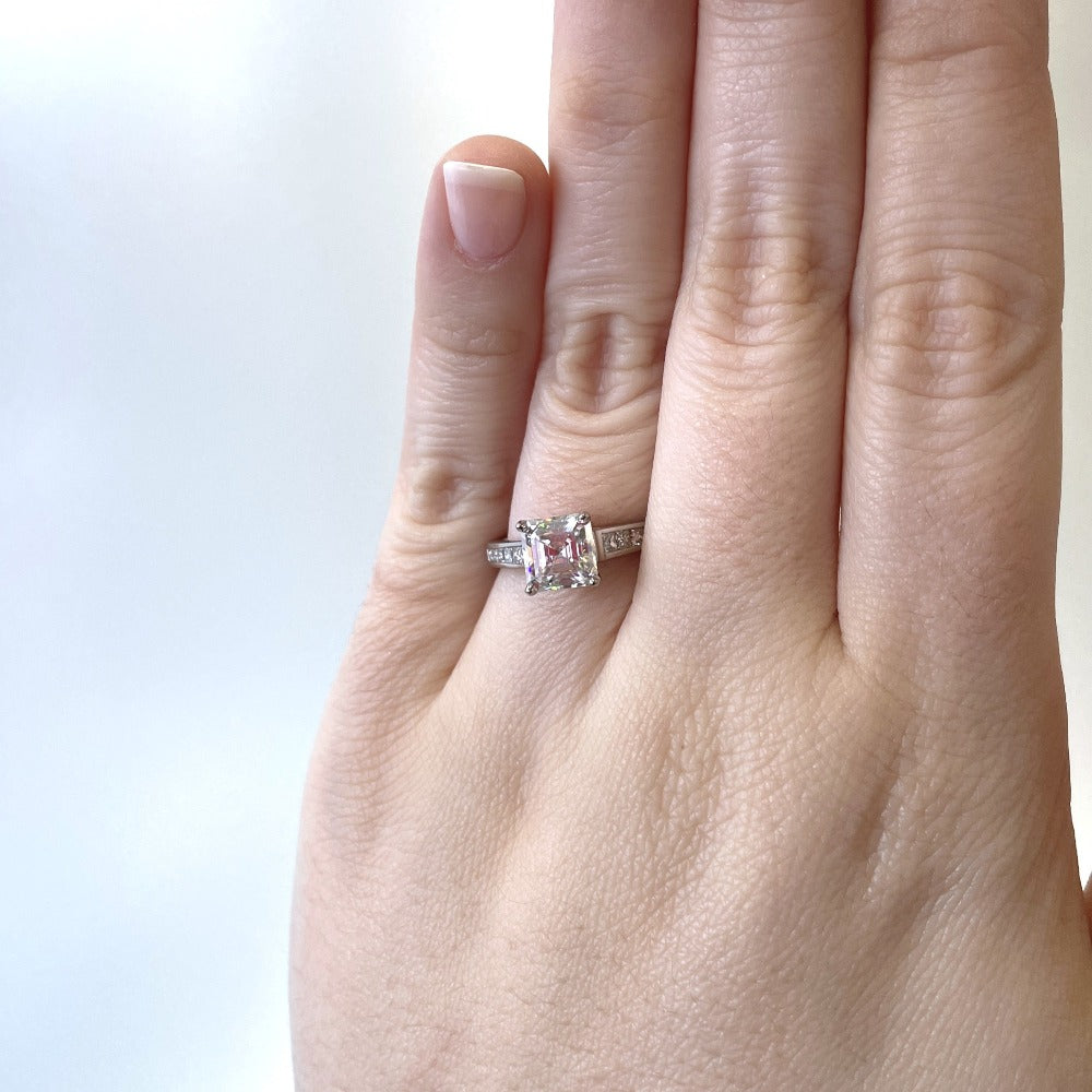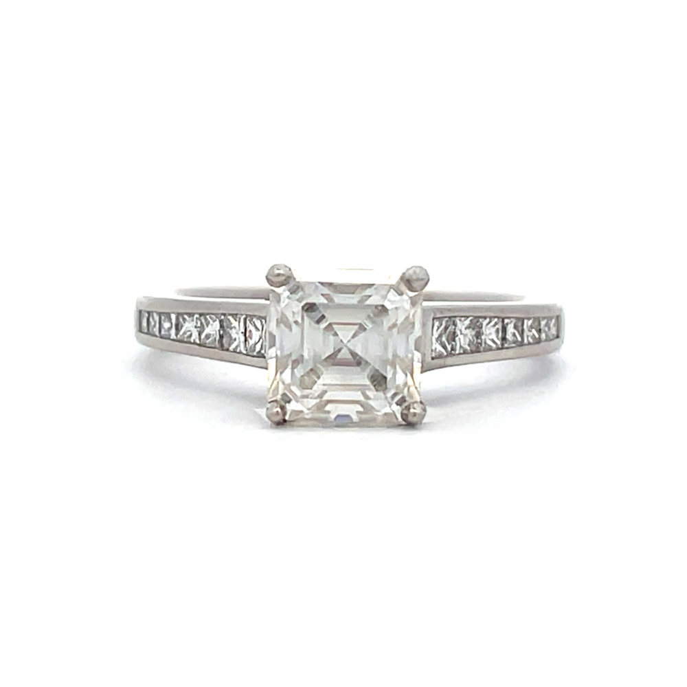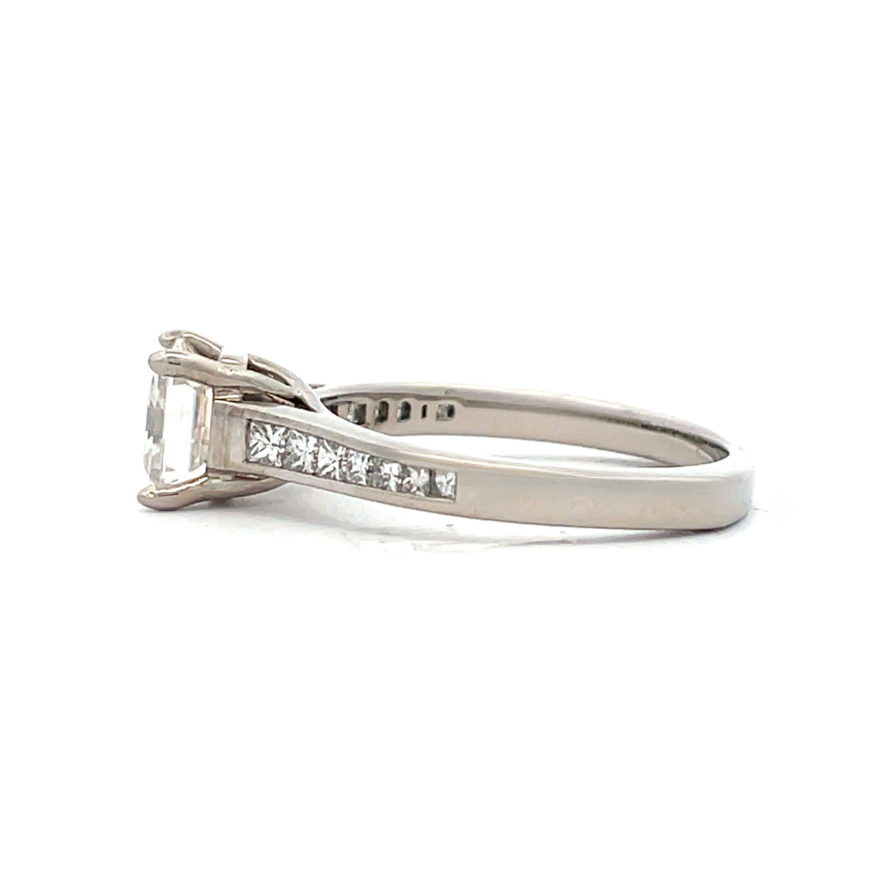 This one-of-a-kind ring is the perfect way to show that special someone how much you care. The enchanting ring features a 1.5CT Lustour simulated diamond center accented by genuine channel princess cut diamonds on either side set in a palladium European shank.