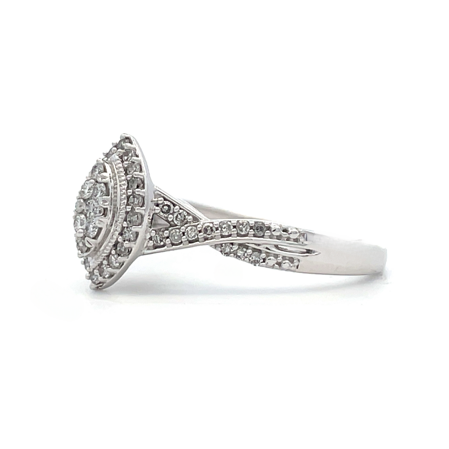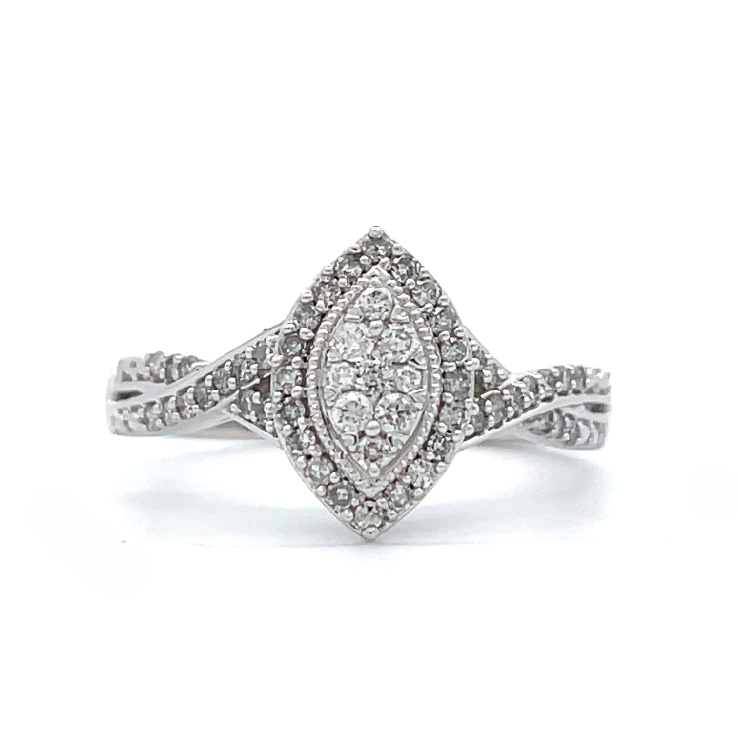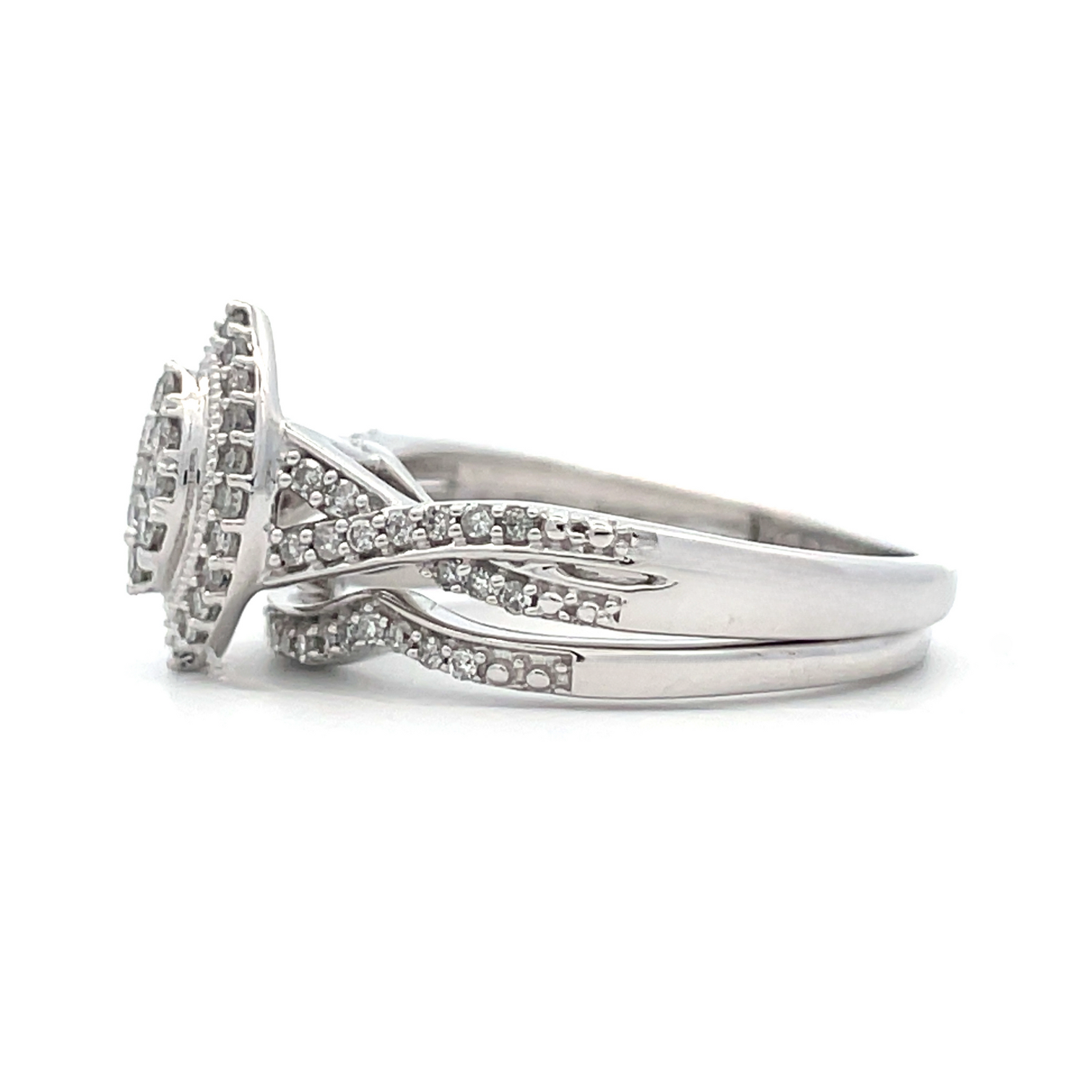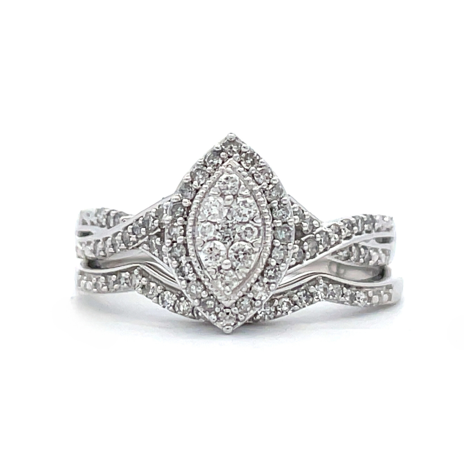 This elegant diamond engagement ring features a marquise shaped diamond cluster center with halo and features a diamond accented criss-cross style shank. This stunning design is the perfect way to start your happily ever after. This engagement ring comes with a gorgeous matching wedding band to complete the timeless look.