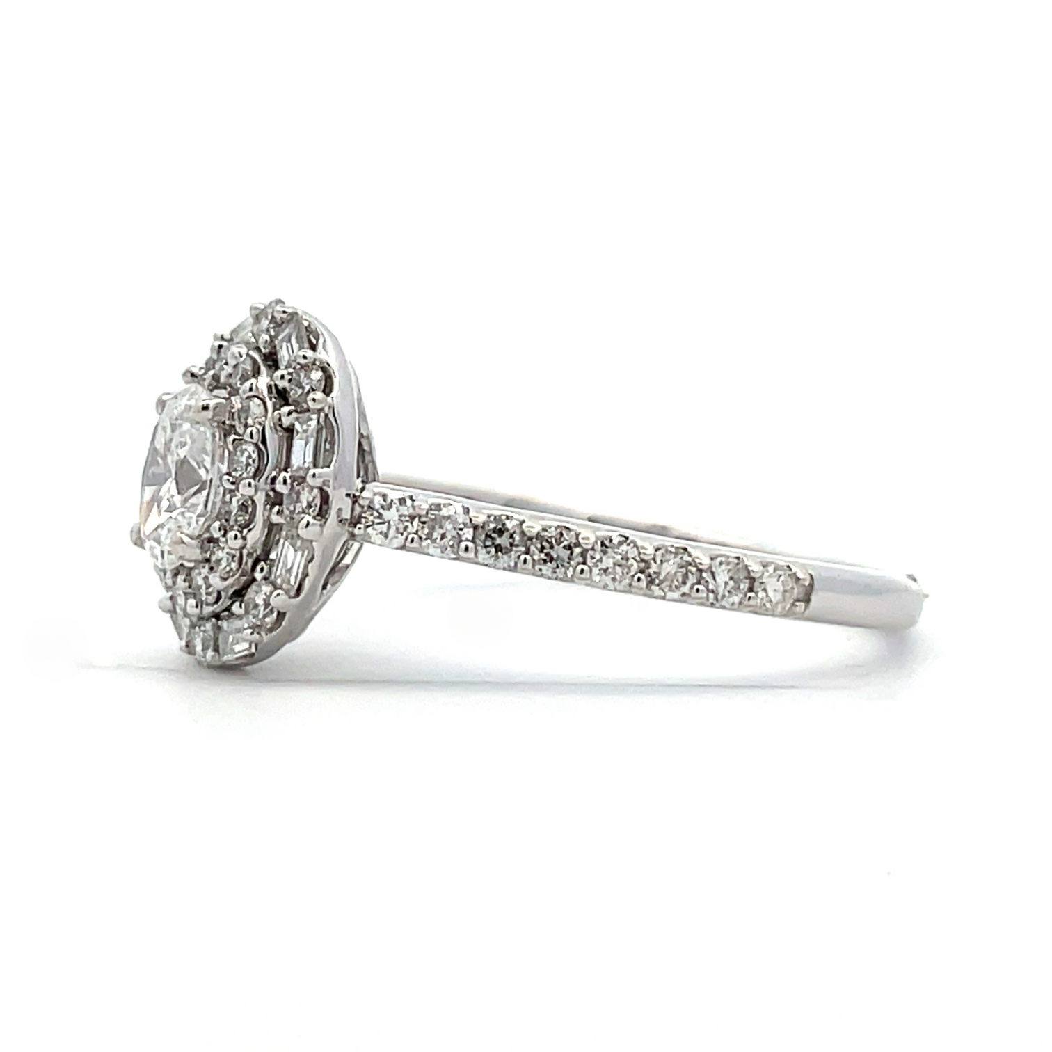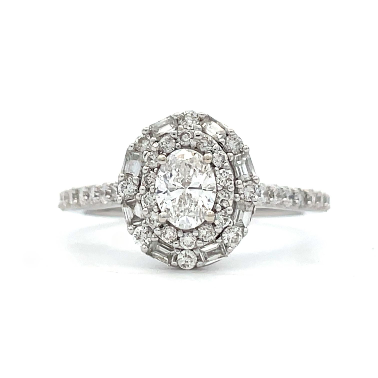 This double halo engagement ring features an oval center stone, an inner halo of round brilliant cut diamonds and outer halo made up of baguette and round diamonds. The ring is made in 14K white gold. Center stone is 3/8th carat, total carat weight for the ring is 1 carat.