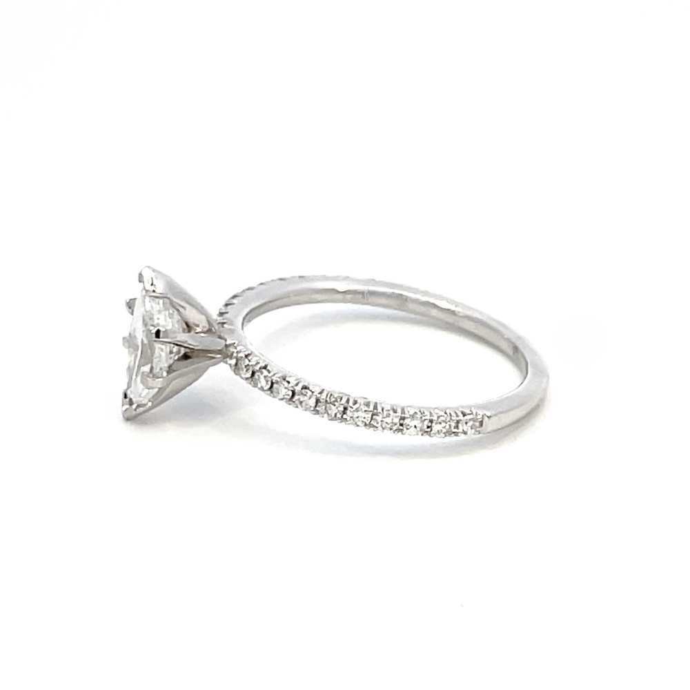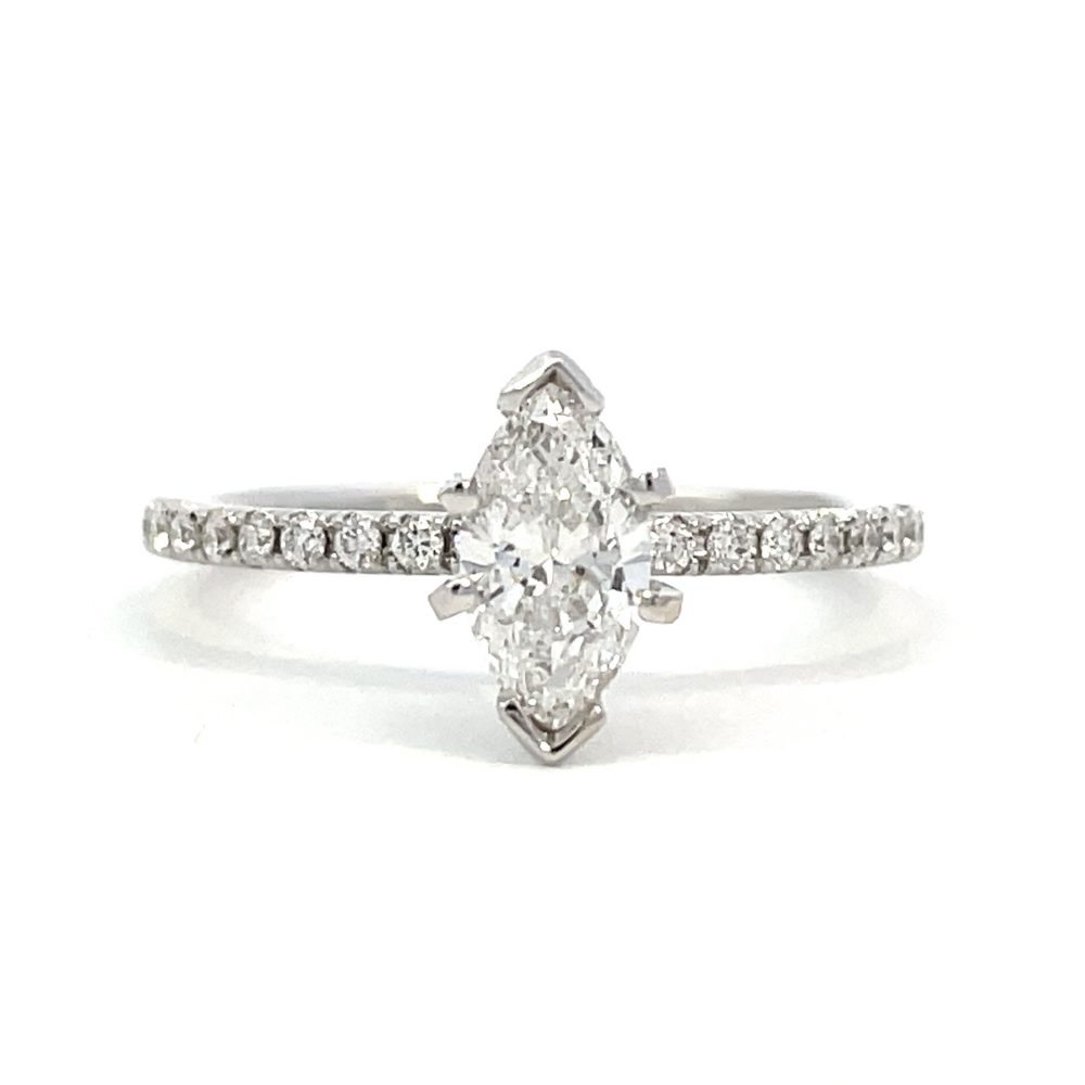 Crafted in luxurious 14 karat white gold, this stunning engagement ring features a striking 3/4 carat marquise cut diamond as its centerpiece. With an additional 1/5 carat of sparkling round accent stones, this ring is sure to make a lasting impression. Elevate your proposal with the elegance of Fernbaugh's Jewelers.