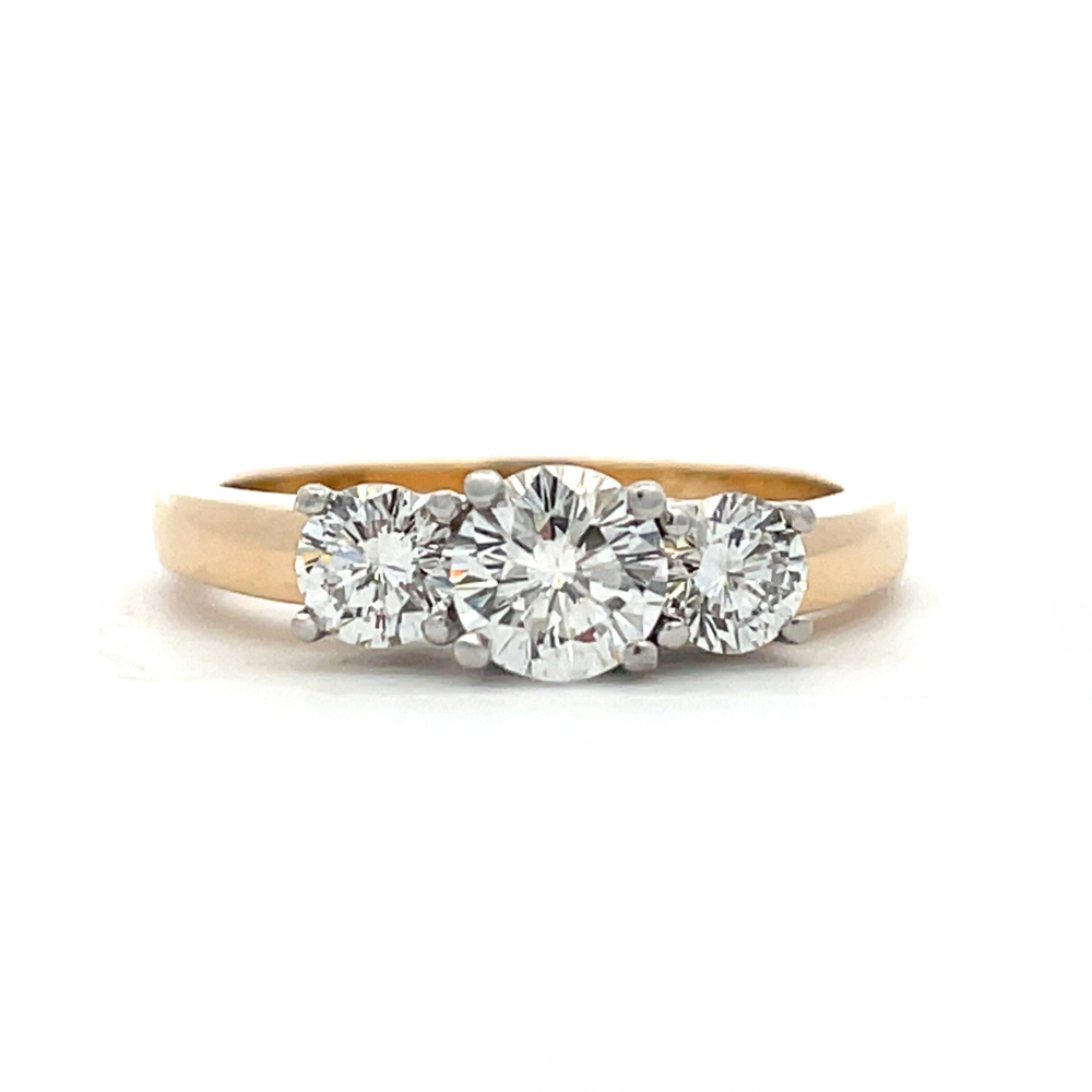 This stunning 14K yellow gold engagement ring features 3 beautifully cut diamonds (1CTW) in a white gold mounting. This three-stone ring represents your past, present, and future, and is the perfect way to represent your beautiful love story.