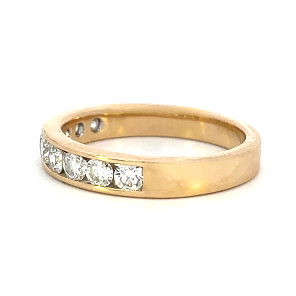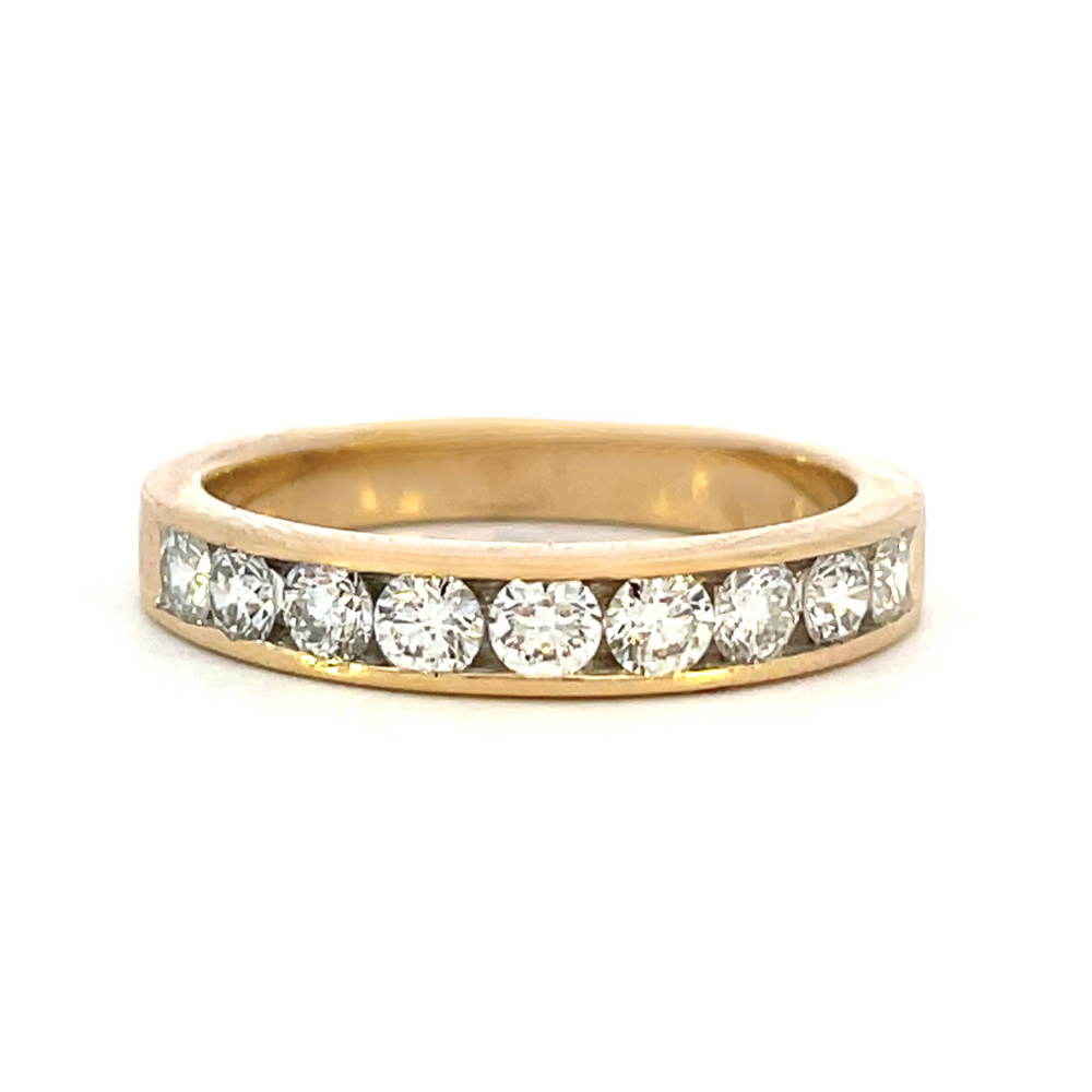This breathtaking diamond band features 9 round diamonds in a classic 14K yellow gold channel setting for a total of .54 carats. This timeless design is sure to leave you smiling for years to come and is a perfect way to say, "I do" as you start your happily ever after.