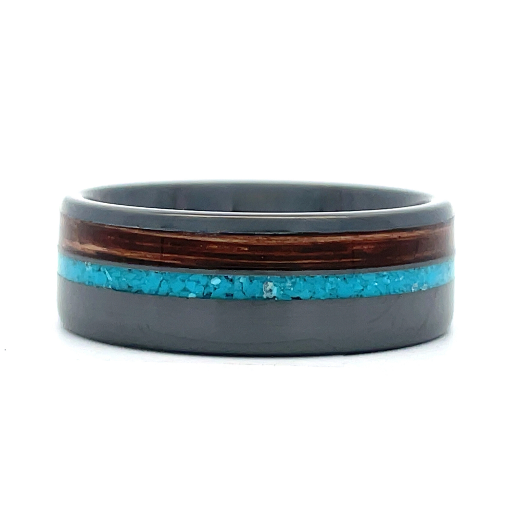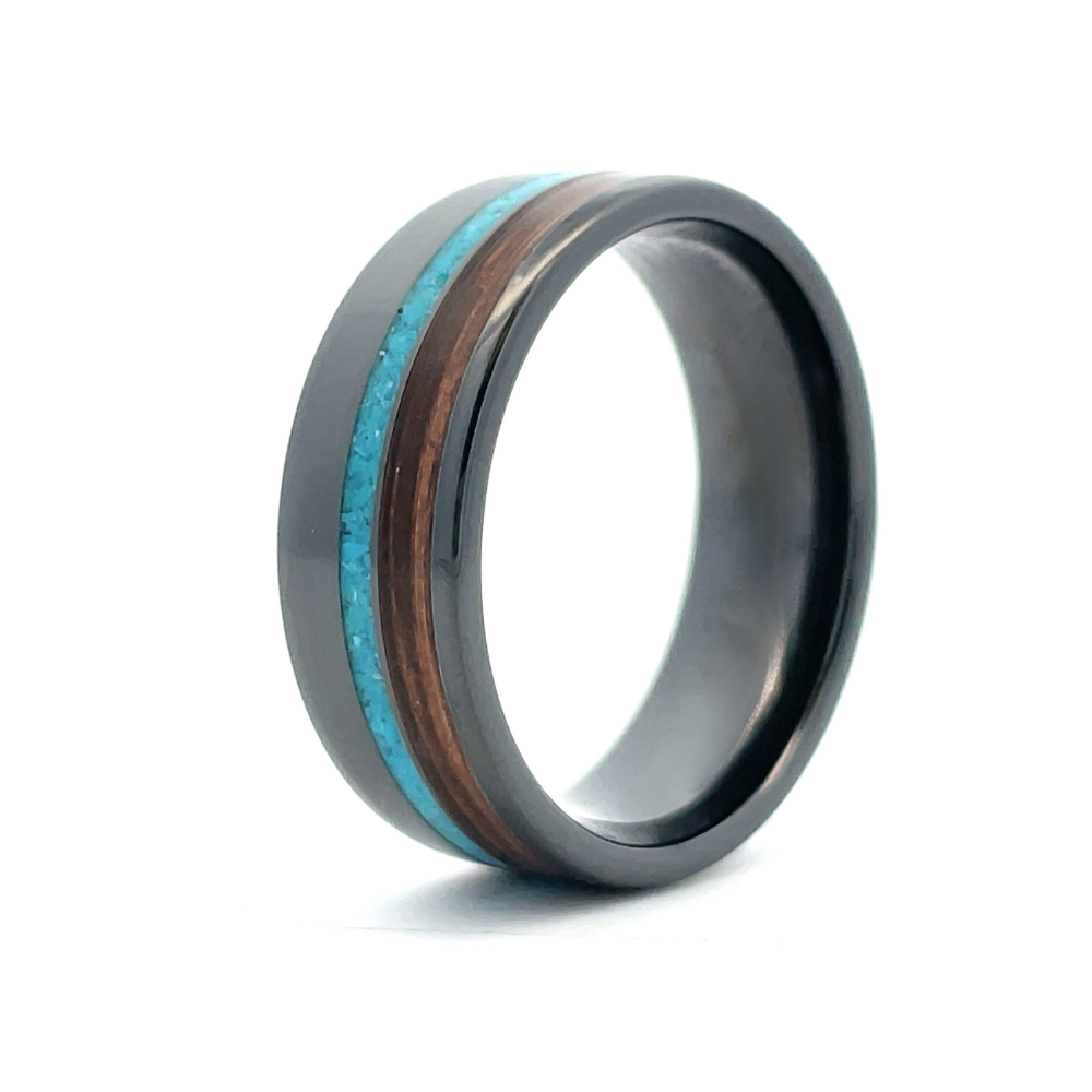 Men's 8mm Black Ceramic Band with Turquoise and Bourbon Barrel Inlay