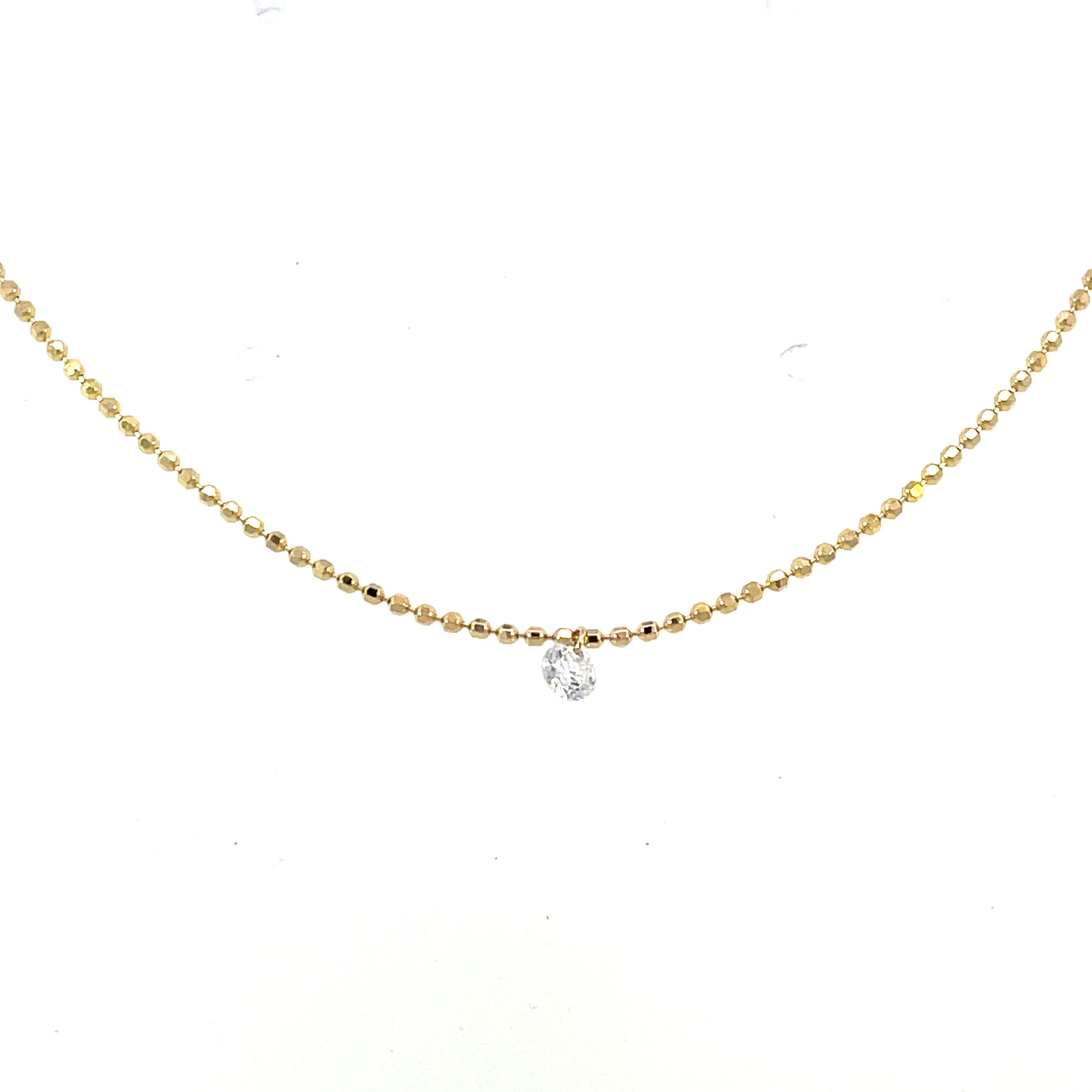 Experience the elegance and brilliance of our 14k yellow gold Dashing Diamond Single-Stone Pendant. With a .08ct diamond suspended from a gold ring, this pendant gives the illusion of a dancing diamond, thanks to a laser drilled hole. Make a statement with this stunning piece.